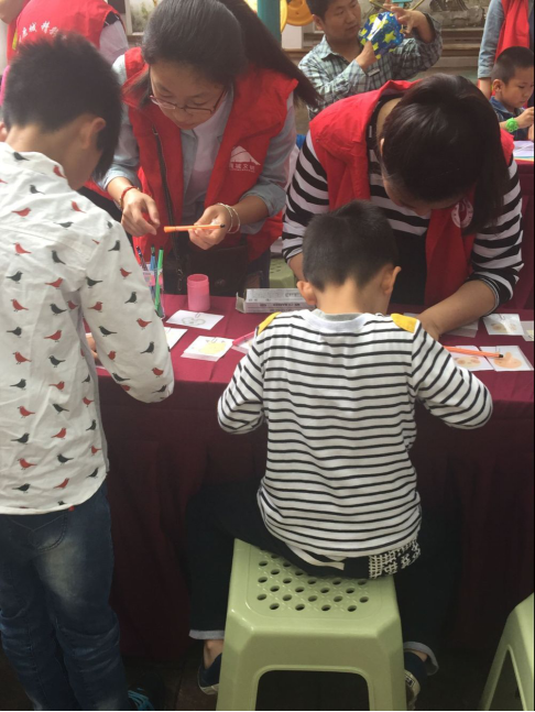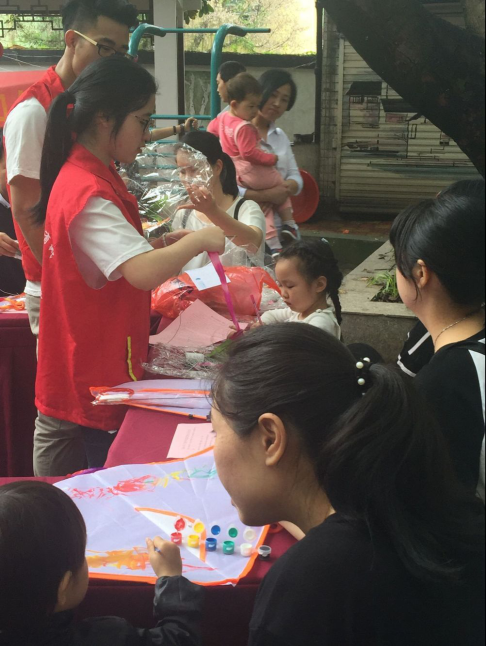 上午9点,志愿者有序来到绿园社区,不等志愿者穿好统一的红马甲,居民就迫不及待地拉他们加入了手工制作中。同学们迅速将队伍以5人为一组分开,一组帮小朋友们一起完成风筝DIY;一组帮助居民制作丝袜花;一组帮忙缝制钥匙扣;一组帮忙制作走马灯……当走马灯点上蜡烛自动开始转的时候,看着小朋友们雀跃的样子,同学们也是满心欢喜。最后俞通海老师、张慧老师与绿园社区的书记进行了洽谈对接,确定下一步志愿者活动的主题和方式,为今后活动开展进行了探讨与沟通。