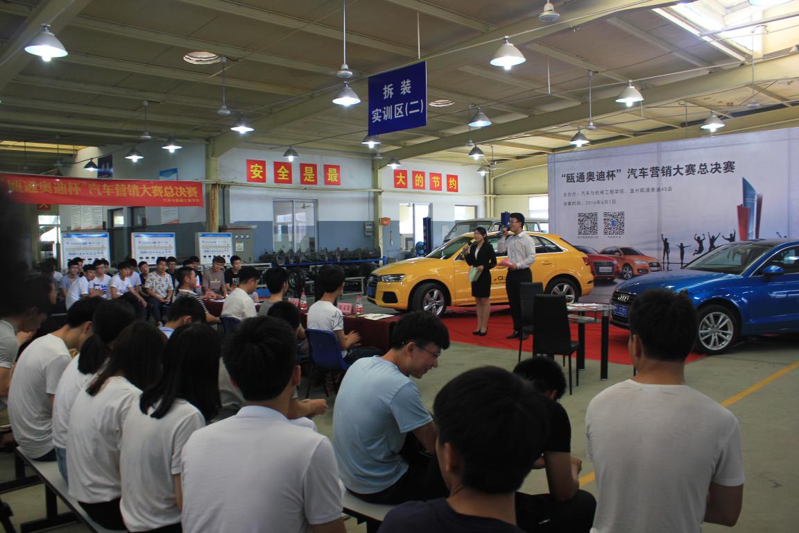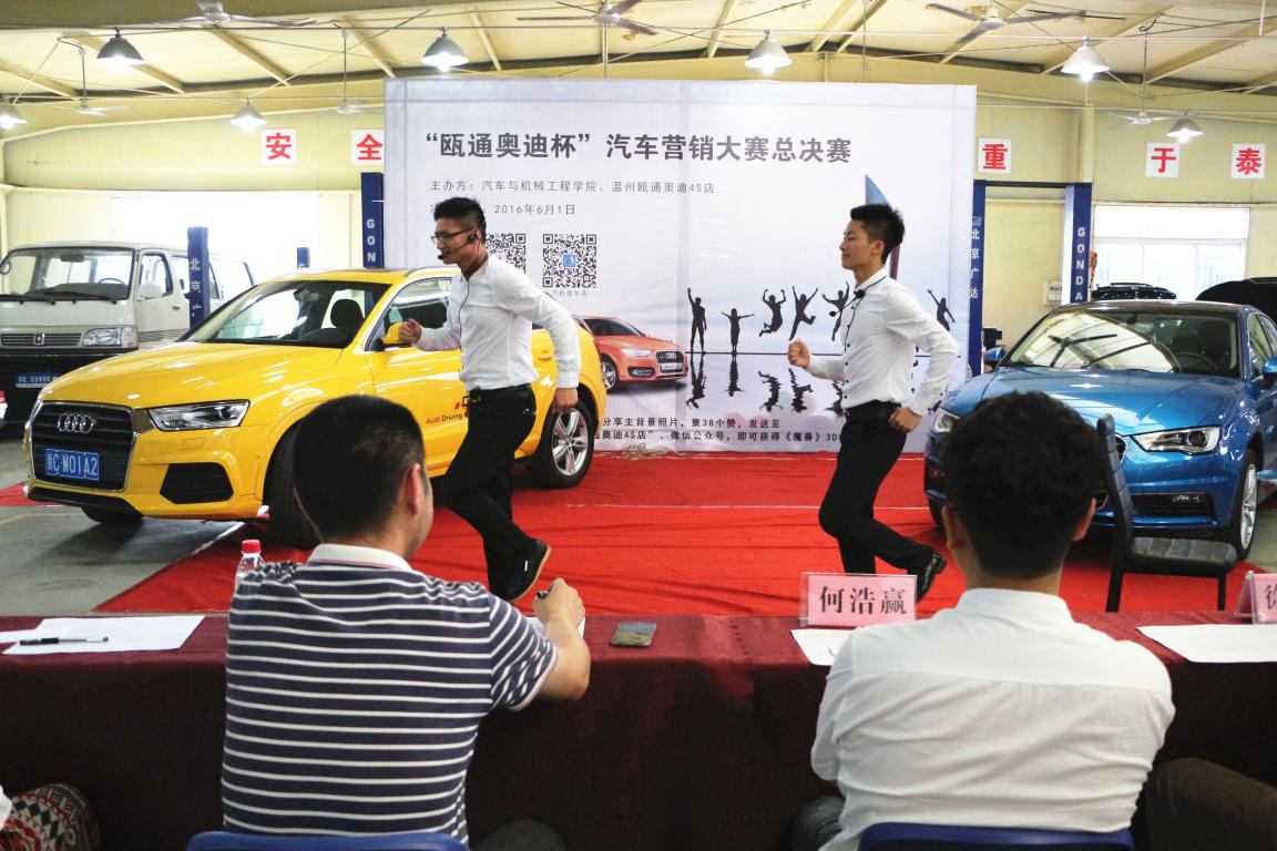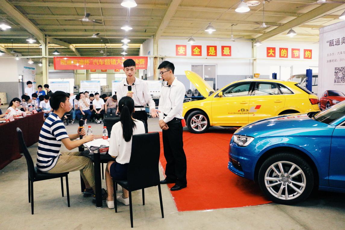 6月1日下午,汽机学院在汽车实训开展“瓯通奥迪杯”汽车营销大赛总决赛,为期近一个月的汽机学院第七届学生技能大赛也随着汽销大赛总决赛结束而落下帷幕。本次大赛得到了瓯通奥迪4s店的大力赞助。比赛以汽车销售真实环境为场景,以汽车销售企业的真实工作项目为载体,进行模拟演练。通过前期笔试,总共有五组十位来自大一、大二的汽销专业学生脱颖而出,进入决赛。