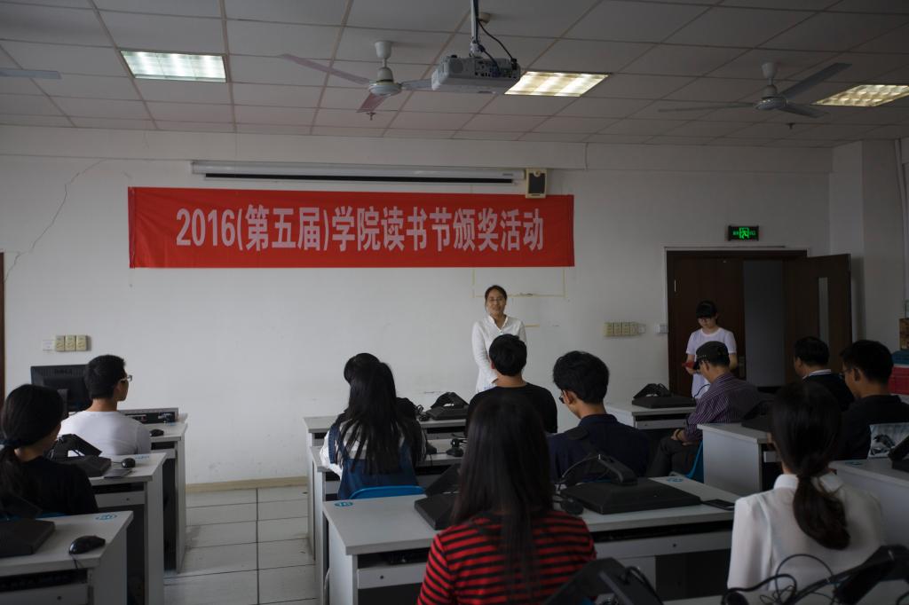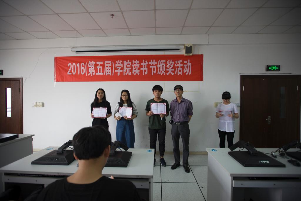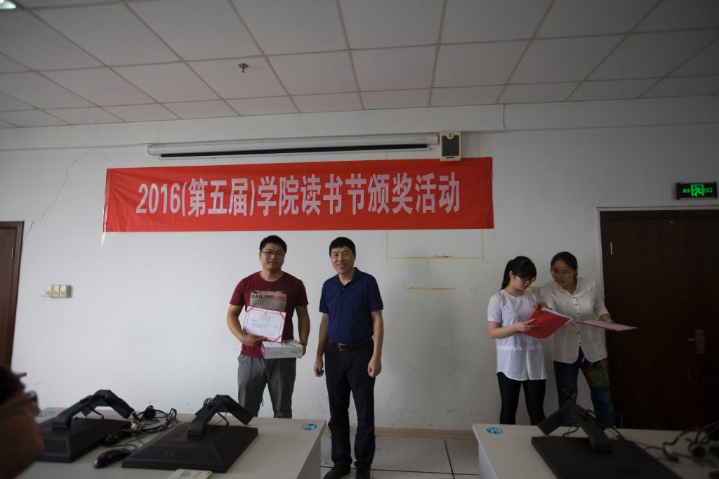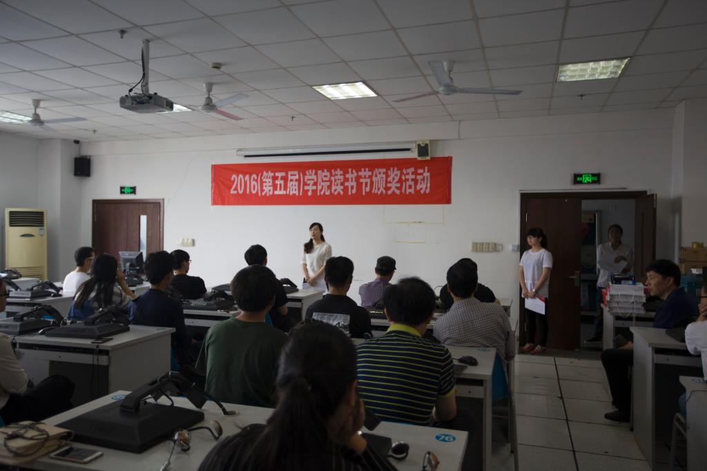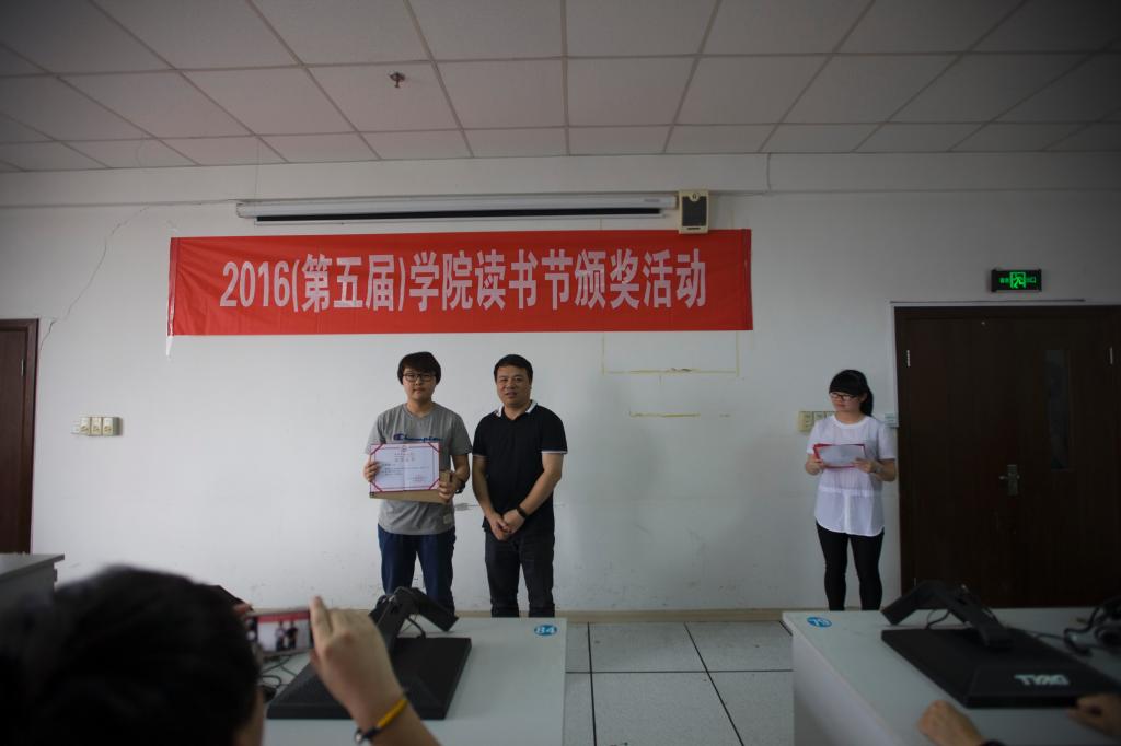 6月3日中午,图书信息中心、院摄影协会和院学生党建服务中心在学院6号教学楼6801教室,共同举办了2016年(第五届)读书节颁奖活动。图书馆馆长钱守义、学生处处长林海春、人文系副书记徐辉三位老师,以及来自学院各分院(系)的师生共约50余人出席本次活动。活动开始,由图书信息中心黄冬妮和寿叶丽两位老师分别介绍图书馆文献资源知识服务发现大赛和“书香工贸”摄影大赛的情况,之后,由主持人宣读获奖名单,钱守义、林海春、徐辉三位老师为获奖者颁奖。
