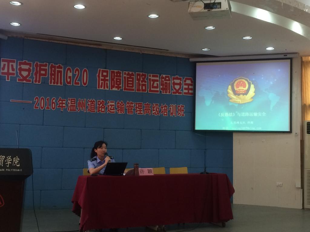 温州市公安局反恐怖支队警官许颖以“《反恐法》与道路运输安全”为主题对道路货物运输企业负责人进行培训,就反恐法的意义、变化、背景、如何落实等方面内容进行了详尽的阐释。