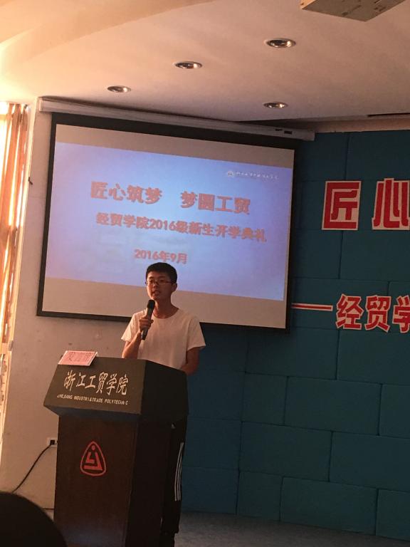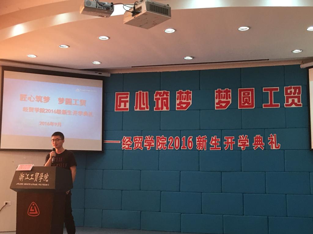 2013级校友杨易韦与2016级学弟学妹分享了自己的大学生活,希望大家怀揣梦想,将优秀作为一种习惯;2015级市场营销1501班李聪向学弟学妹们介绍了自己的社团、竞赛以及工学结合的经历,勉励大家用洪荒之力坚持自己最初的梦想;2016级新生代表国贸1601班莫涛表达了自己对温州这片创新创业热土的憧憬,以及自己在即将开启的大学生活的规划。