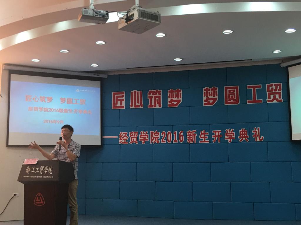 典礼在国歌声中拉开帷幕。项老师首先对2016级新生表示热烈的欢迎,然后指出,与小学、中学的基础教育不同,大学是一个人能力和世界观形成的关键时刻,大学三年所做的一切都是为将来的职业积蓄能量,不仅要学会做事,更要学会做人。最后项老师向2016级新生就如何度过大学三年提出四点希望和要求:一是树立远大理想,明确筑梦方向。他指出,立德树人是教育的根本任务,作为大学生肩负着社会主义建设者和接班人的重任,因此必须要有责任意识和担当意识,为国家负责、为社会负责、为集体负责、为家庭负责、为自己负责,要树立正确的世界观、人生观和价值观,要带头践行社会主义核心价值观,树立马克思主义宗教观;二是尽快适应,寻回最初的梦想。他希望同学们尽快适应职业教育,适应工贸的创新创业教育氛围,适应经贸分院的团队,适应大学的学习生活;三是尽早规划,培育个人梦想。他希望同学们找到适合自己的发展路径,利用学校、分院的各种平台,规划好自己大学三年的学业规划、将来的职业规划和人生规划,并付诸于行动;四是从点滴做起,成就最终梦想。项老师指出,任何理想的实现、梦想的实现,都是从注重细节开始的,他希望同学们从学习的点滴做起、从生活的点滴做起、从实践的点滴做起,培育自己良好的学习习惯、生活习惯、礼仪习惯、安全防范意识习惯,为梦想的实现集聚能量。