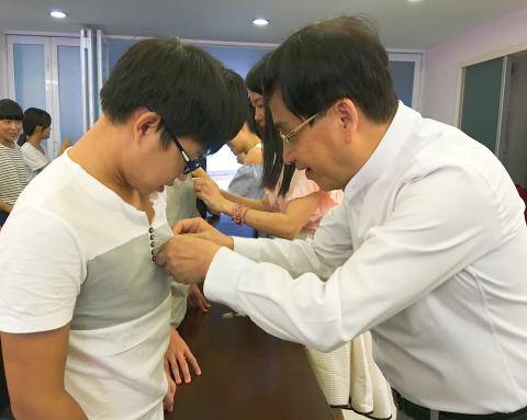 老师们为新生佩戴校徽