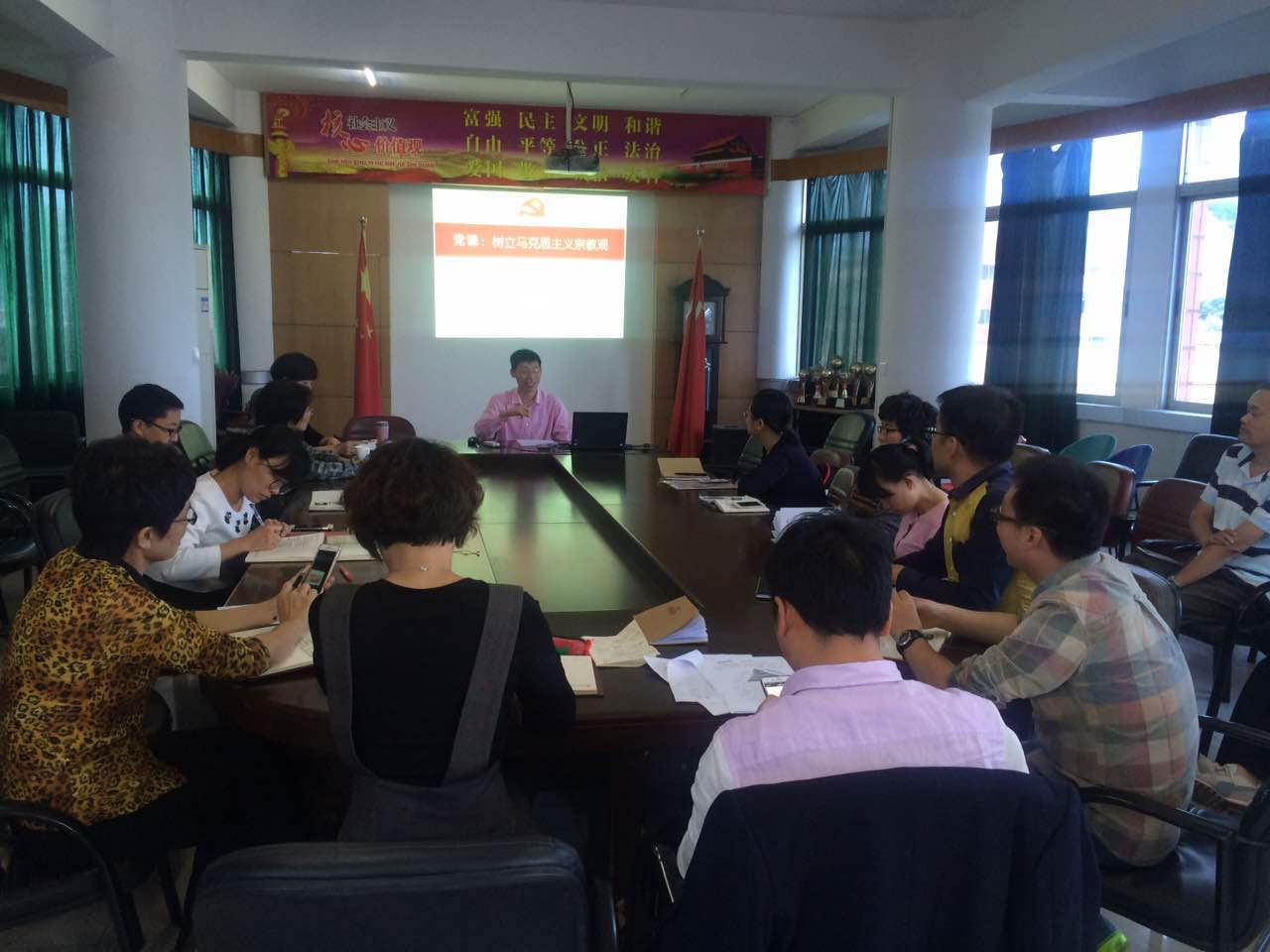 项老师首先传达了《中共浙江省委教育工作委员会办公室转发中共浙江省委办公厅关于认真组织学习习近平总书记在全国宗教工作会议上重要讲话精神的通知》(浙教工委办〔2016〕22号)文件精神和《中共浙江工贸职业技术学院委员会关于深化“两学一做”学习教育的通知》(浙工贸党〔2016〕25号)文件精神;学习了习近平总书记在全国宗教工作会议上的讲话精神。项老师指出,习近平总书记在全国宗教工作会议上强调:“实行宗教信仰自由政策,出发点和落脚点是要最大限度把广大信教和不信教群众团结起来。”、“要坚决抵御境外利用宗教进行渗透,防范宗教极端思想侵害。要高度重视互联网宗教问题,在互联网上大力宣传党的宗教理论和方针政策,传播正面声音。”、“积极引导宗教与社会主义社会相适应,一个重要的任务就是支持我国宗教坚持中国化方向。”等,给我们树立马克思主义宗教观指明了方向,需要我们进一步加深学习。