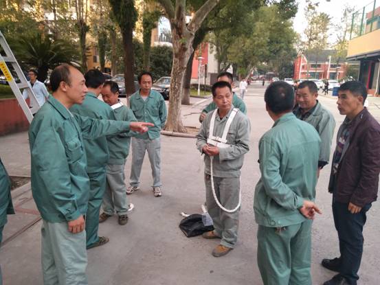 6、开展一次安全生产演练。总务处将培训课堂安排到室外,讲解安全带、安全绳如何穿戴、如何使用,什么情况必须使用等问题。现场每个员工分别穿戴安全带、安全绳、现场演练高空作业,爬上屋顶,开展屋顶清理,使用梯子、安全绳进行现场安全示范作业。章纪顺处长现场指导,并详细讲解作业过程中要注意的安全点。通过理论和实操的培训,员工纷纷表示此次培训受益匪浅,今后要注意安全预防,安全作业。