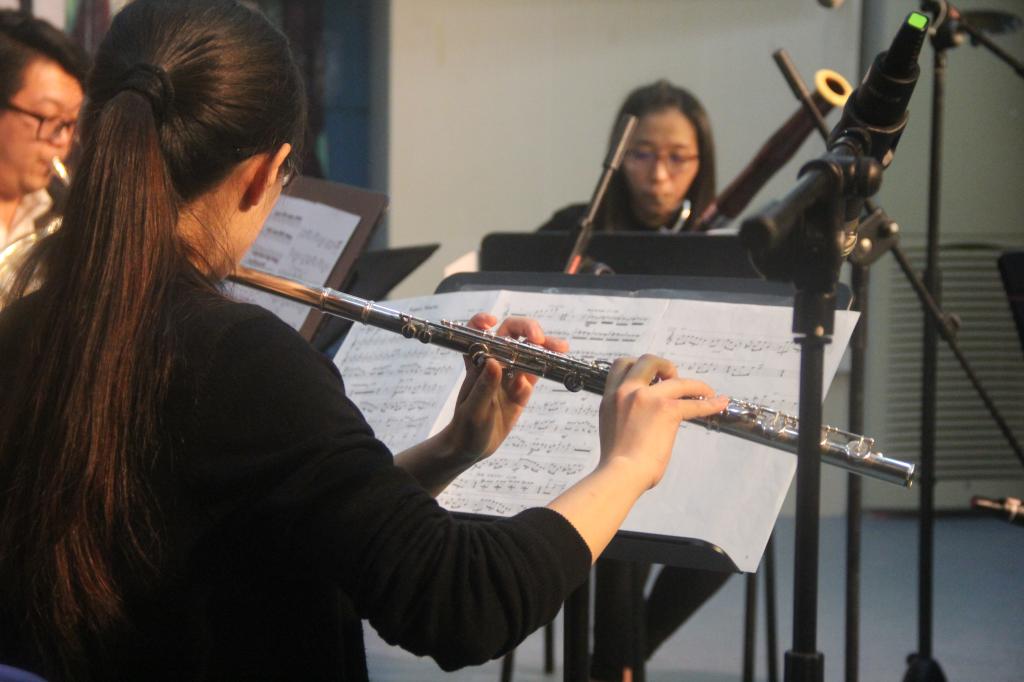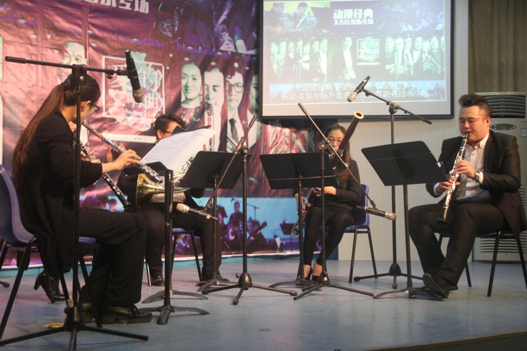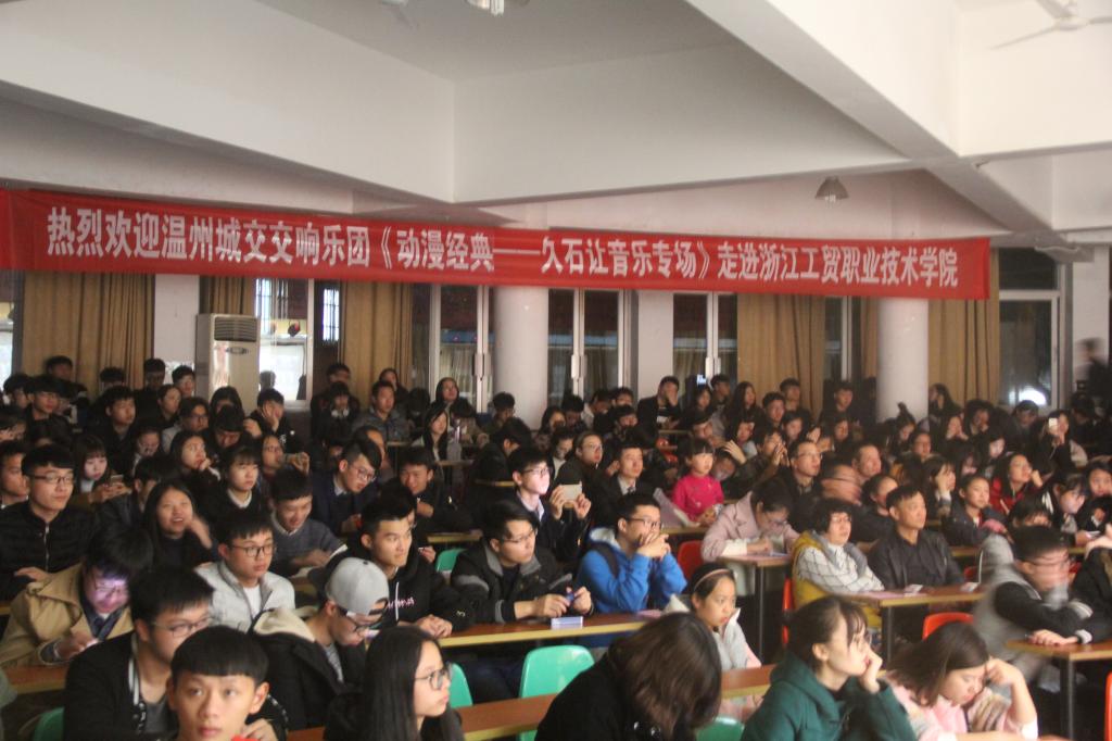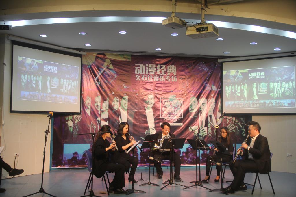 就好似打开了潘多拉的魔法盒,交织着神秘,优雅,缥缈的音符,化成魔咒,唤醒了我们沉睡的听觉,2016年11月29日晚18:30,由温州城交交响乐团木管五重奏带来的《动漫经典——久石让音乐会》在阶梯教室拉开帷幕。阶梯教室座无虚席,师生代表观看了演出。
