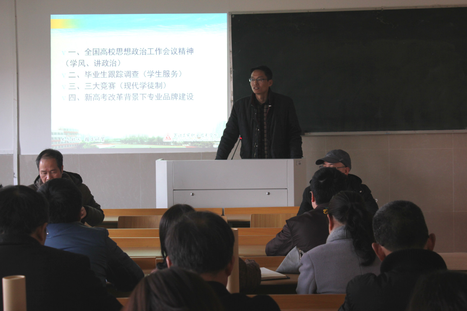 吴书记首先谈到国家主席习近平出席高校思想政治工作会议,这是建国以来,党的总书记第一次参加全国高校思想政治工作会议并讲话,可以看出我们党和国家对高校思想政治工作的重视提到了前所未有的高度。其次,书记介绍了高校思政工作会议的主要精神,例如将立德树人作为中心环节,把思政工作贯穿教育教学过程;使得思政工作围绕学生、关照学生、服务学生,不断提高学生的思想水平、政治觉悟和道德品质等;此外还需要继续加强辅导员、班主任和教师党员等队伍建设。最后,吴书记对教师党员们提出希望,要重视并投身思想政治工作,做好对入党学生的思想和引导教育、做好教育教学的本职工作、关注学风建设和特殊生工作、在毕业生跟踪调查中发挥作用。同时,吴书记也希望教师党员们应发挥自身优势,带领学生们主动学习并参加挑战杯、职业生涯规划大赛和“互联网+”大赛,发挥党员的带头作用,体现党员的先进性。