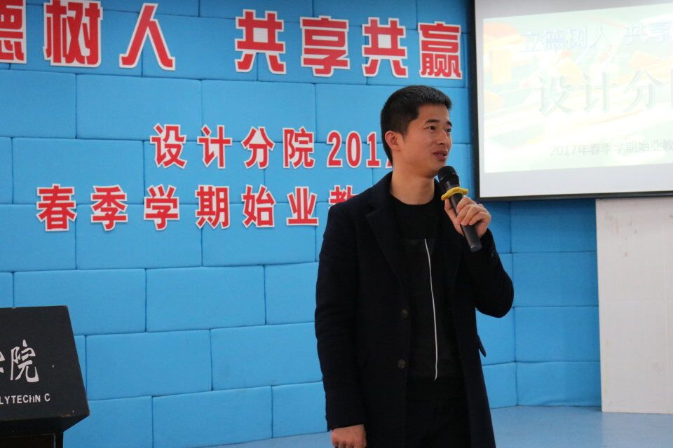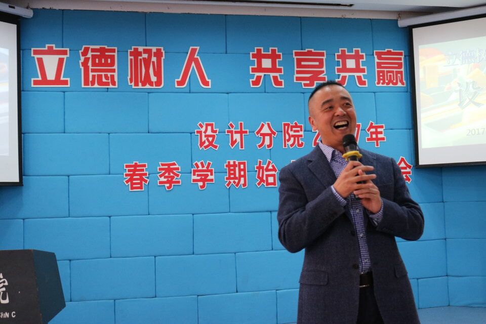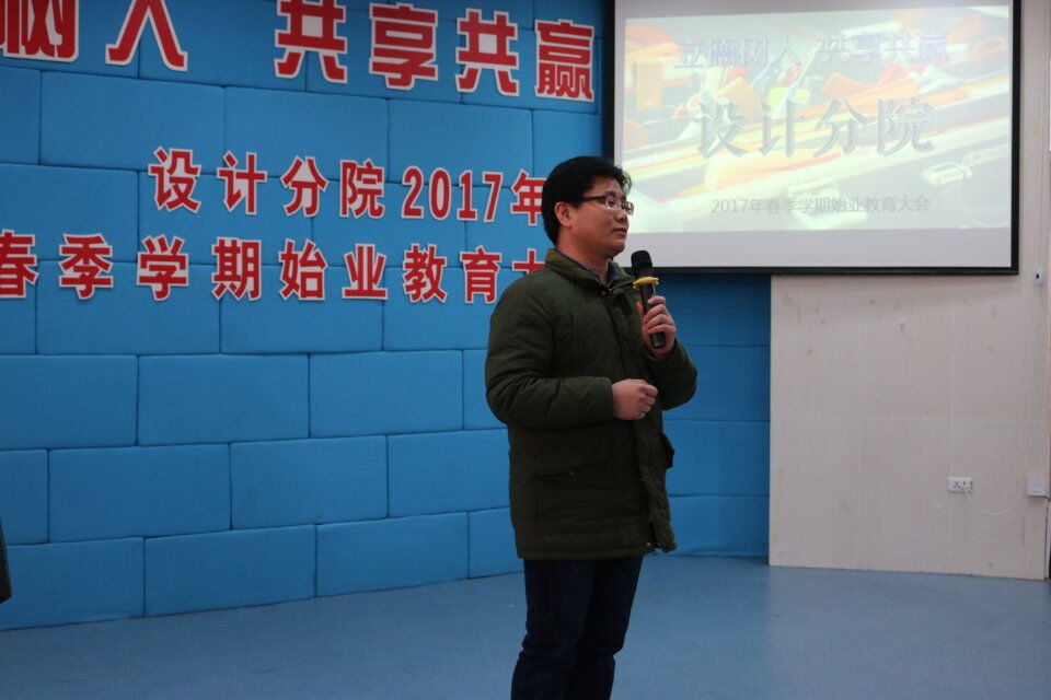 最后,设计分院书记杨松涛作总结致词。对于2017年设计分院的正式成立,杨老师有着诚挚的祝福,他希望全体师生能够秉承先进集体的理念,加强设计分院的礼文建设,做到“立于礼,游于艺”,将设计分院办得越来越好。他结合“闻鸡起舞”、“山鸡舞镜”两大成语典故,指出任何时候勤奋努力都为时不晚,同学们不要在网络世界中麻痹内心,要多走出寝室与人交流、多走向运动场增强体魄。杨老师还提出四个回归:“回归读书、回归梦想、回归本分、回归初心”,读书是为了某一个时段遇到更好的自己,同学们除了专业书还要多读人文类、社科类各类优秀书籍。杨老师告诫同学们要有好的身体,勤奋是通向理想的阶梯,做人是成功的基础,不忘初衷,方得始终。最后,他告诉同学们一大喜讯:设计分院在2016年度被评为“先进集体”,这是全分院师生共同努力的结果。2017年需要师生齐心继续努力,不虚度、不退步,一起创造设计分院更好的成绩。