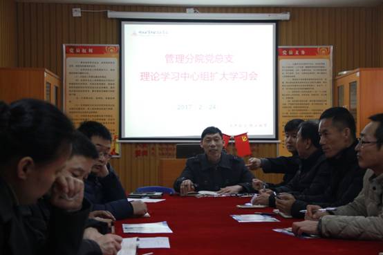2017年2月24日,管理分院在五号教学楼一楼管理分院党员之家召开管理分院党总支理论学习中心组扩大学习会,专题学习新高考改革,研讨专业内涵建设和专业宣传工作,管理分院党政工班子、党总支委员、专业主任、教学督导、全体行政人员等参加。学习会由管理分院党总支书记项光春老师主持。