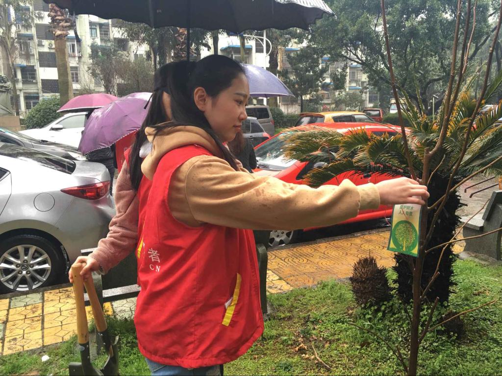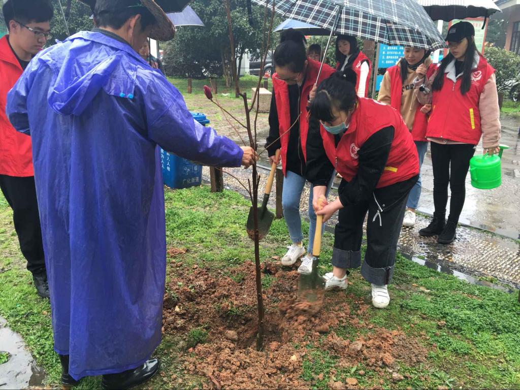 天公不作美,下着连绵不断的小雨,但这丝毫没有减弱同学们种树的热情。大家两两合作分组,一人撑伞,一人做事。挖坑、护树、埋土、压土,工作有条不紊。虽然挖坑需要很大的力气,但女生们不甘示弱,尽心尽力的挖着,更多的是享受过程,用心去完成各项任务。随后,大家还将社区准备好的“保护树木”标识挂着刚种的小树上,提醒社区居民保护绿色。