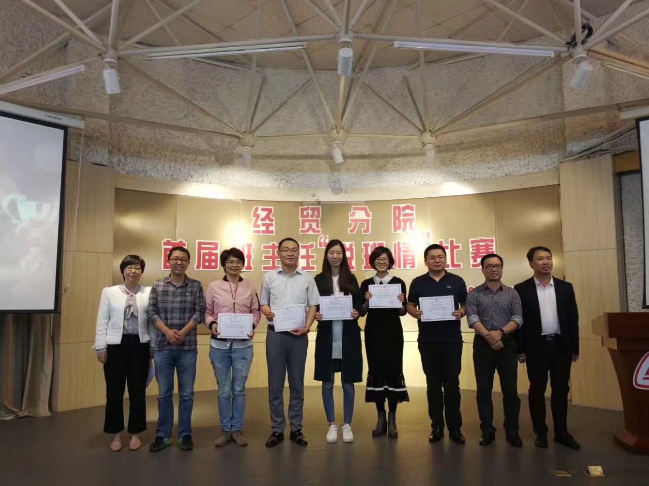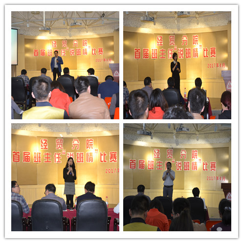 为了进一步落实全国、全省高校思政工作会议精神,加强班主任队伍建设,提高班主任队伍的整体素质,搭建一个相互交流、取长补短的平台,4月26日下午,经贸分院在一号楼多功能厅举行首届班主任“说班情”比赛,经贸分院全体辅导员、班主任和相关学生代表观看了比赛。
