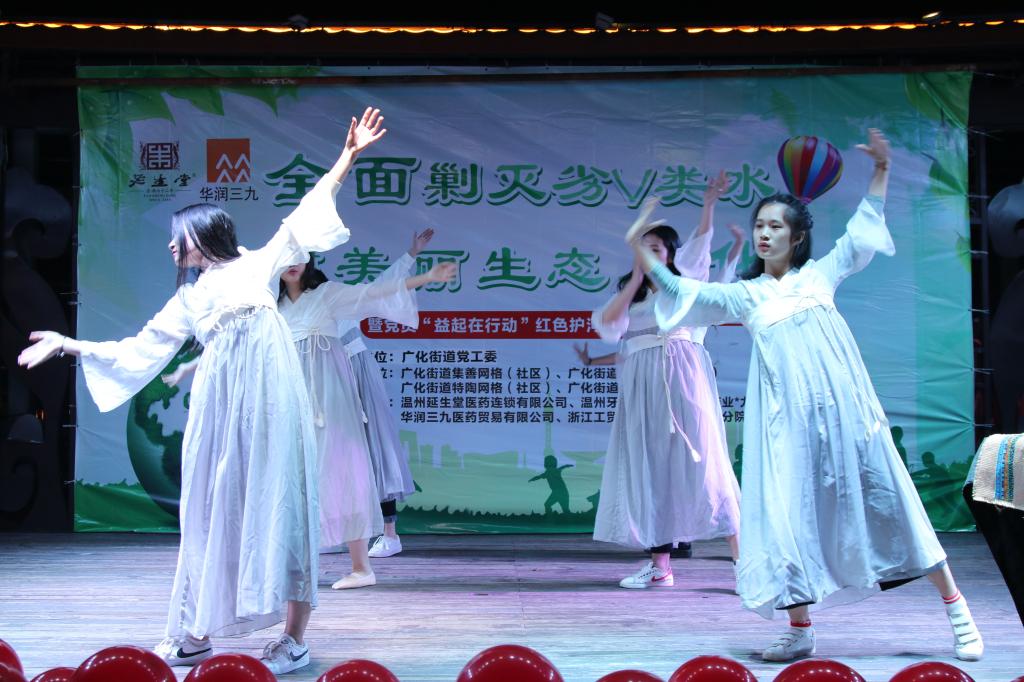 文艺汇演以“全面剿灭劣V类水,建美丽生态广化”为主题,所有节目由浙工贸管理分院学生和社区群众自编、自导、自演。演出一开始,社区表演的节目《祖国你好》充满朝气,红红火火,率先炒热了现场气氛。接着举行红色护河队授旗仪式、宣读红色护河倡议书等。随后由浙工贸管理分院带来的合唱歌曲《映山红》,他们美妙动听的歌声时而高昂,时而悠扬,令人陶醉。随后神奇有趣魔术,还是唯美优雅党的舞蹈表演,都深深地吸引住全场人的目光,令人拍案叫绝、掌声不断。压轴由工贸学院管理分院带来的小品《同学会》,在小品逗趣的气氛中融入剿灭劣V类水理念,不经意间增强了我们剿灭劣V类水,建美丽生态的理念。欣赏完幽默搞笑的小品之后,我们来了一场观众互动,以全面剿灭劣V类水与平安消防知识为题目,进行有奖问答,将全场气氛嗨到最高潮。