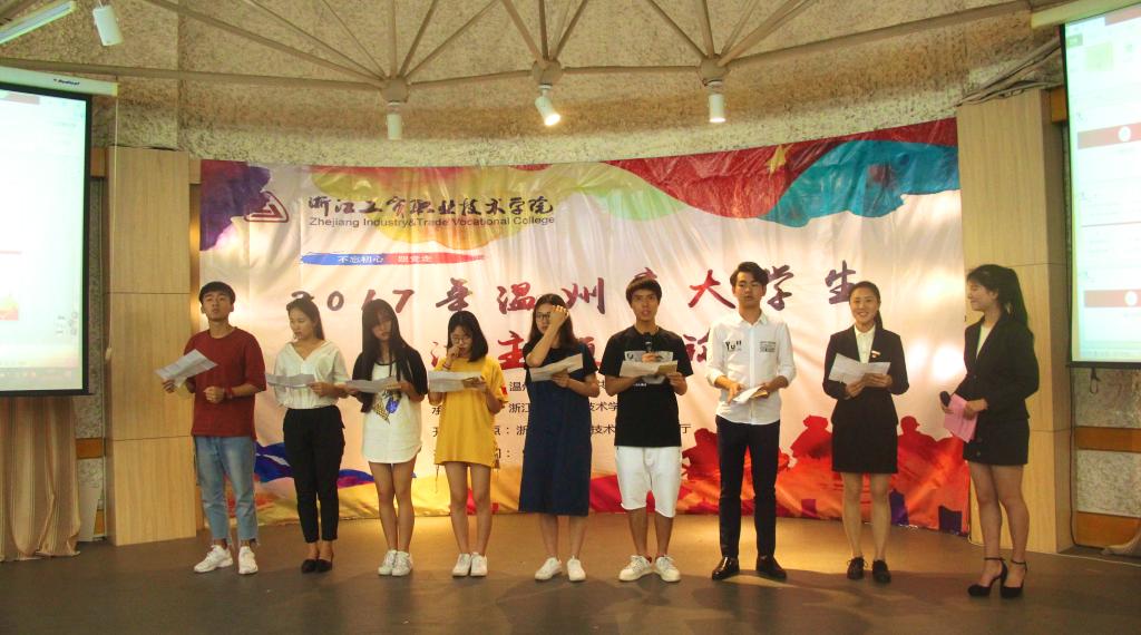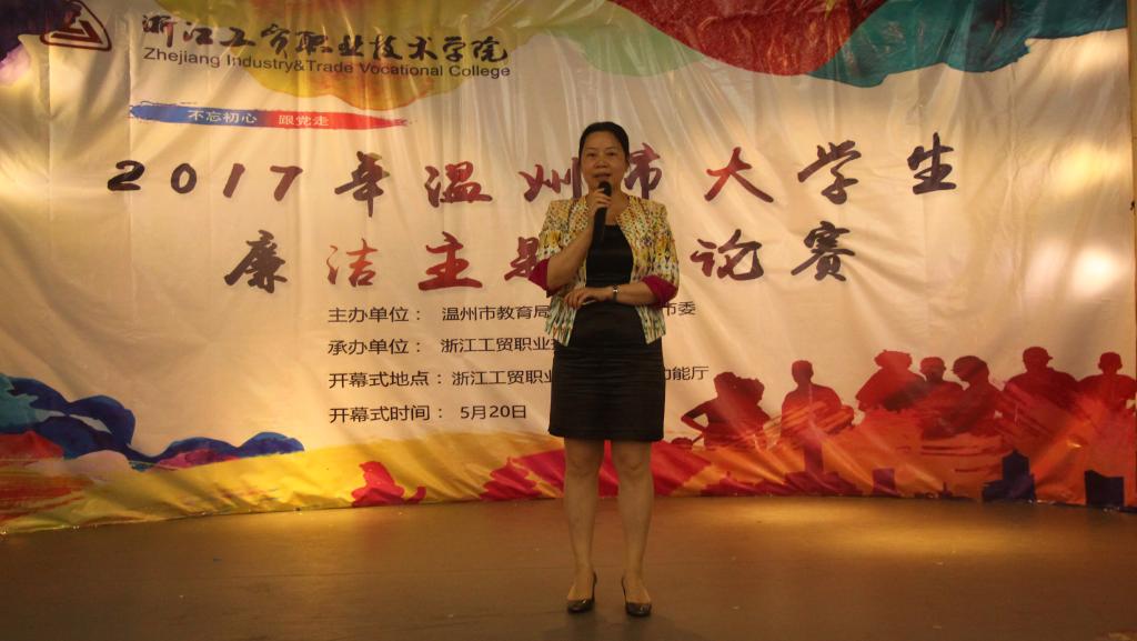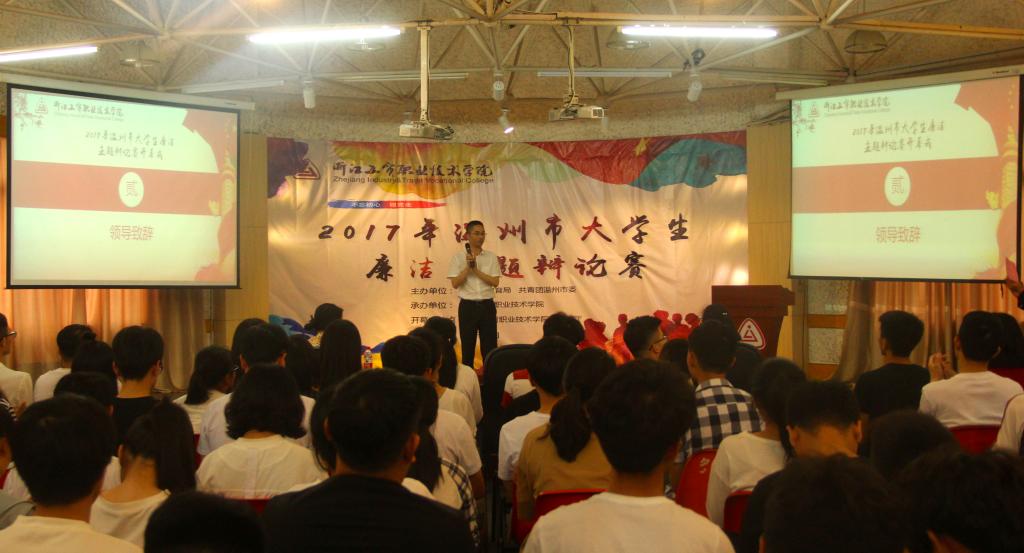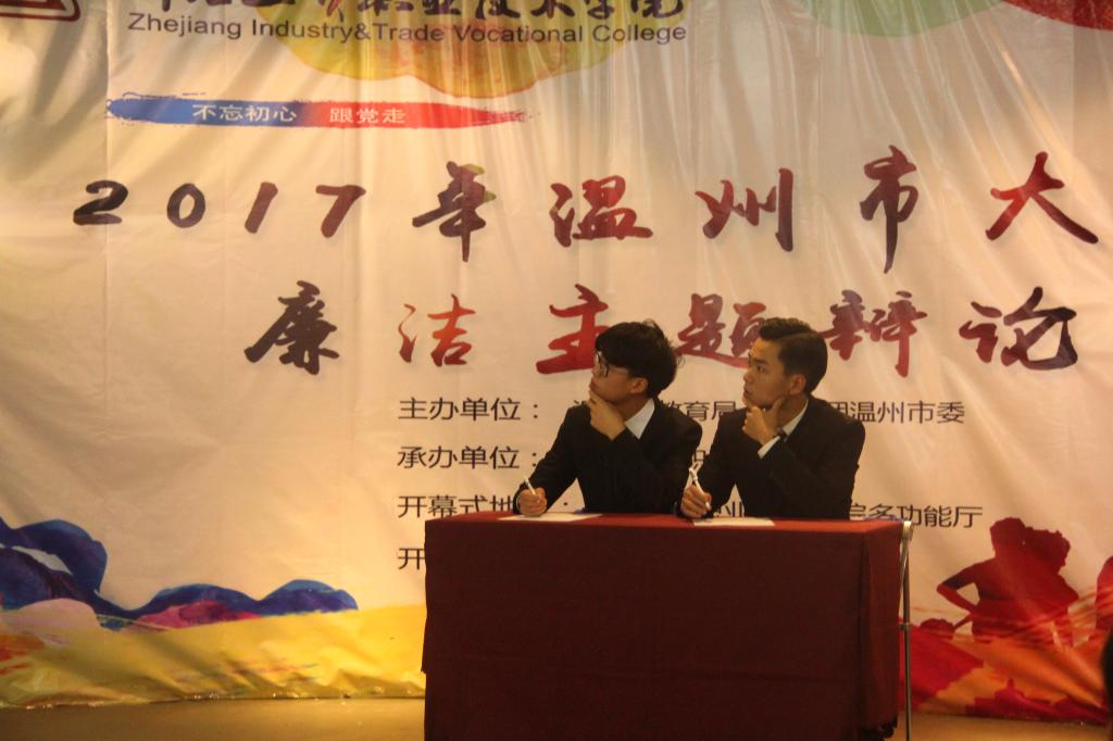 朱与黑,双方齐过招;辩对错,唇舌浪滔滔。2017年5月20日,由温州市教育局和共青团温州市委联合主办,浙江工贸职业技术学院承办的“不忘初心跟党走”2017年温州市大学生廉洁主题辩论赛开幕式在我院多功能厅举行。本次开幕式有幸邀请到了温州市教育局高教处黄万统处长,学院党委委员、纪委副书记黄专途老师和温州团市委学少部部长助理高莎老师出席。共有8所在温高校参加今年的辩论赛活动,他们分别是:温州医科大学、温州大学、温州商学院、温州职业技术学院、浙江工贸职业技术学院、温州科技职业学院、浙江东方职业技术学院和浙江安防职业技术学院。