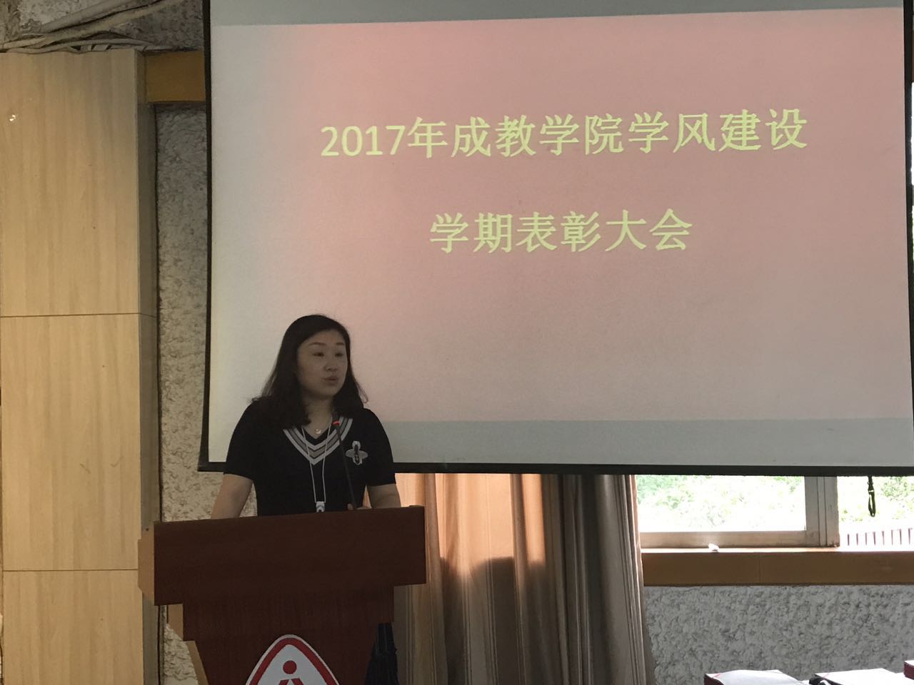 2017年5月24日中午13时00分,2017年成教学院学风建设学期表彰大会在一号楼多功能报告厅召开。到场的老师分别有教务部主任杨鹏、学生管理部主任潘丽瑶、辅导员林虹、许多和章鑫洪老师。本次大会由学生管理部主任潘丽瑶担任主持人,在她宣布大会开始后,表彰正式开始。