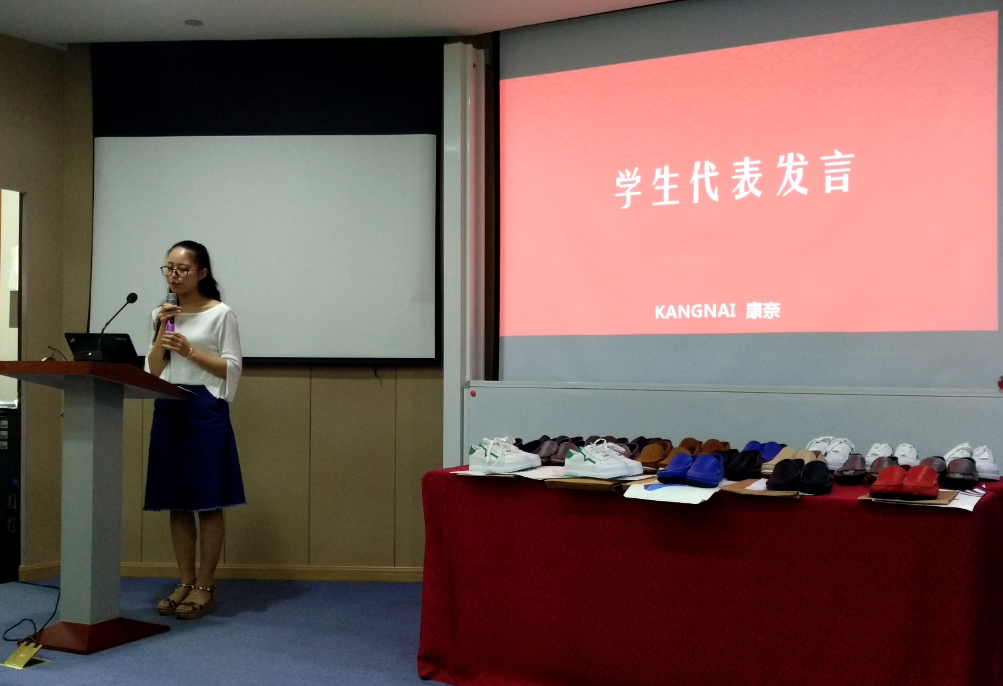课程汇报由学生汇报、企业主管教师点评、优秀作品颁奖、首届康奈奖学金颁奖等四个环节组成,汇报结束后,汪焰副院长与郑莱毅总经理分别代表学院和康奈对本次活动进行了点评。汪焰副院长对康奈集团领导及相关负责部门为康奈班的付出表示感谢,并用“遇见”、“感恩”和“期待”这三个关键词勉励康奈班学生抓住机遇,遵循“匠心”、“极致”和“精准”的专业学习理念,未来走得更好。郑莱毅总经理首先对获得康奈奖学金的同学表示祝贺,并对康奈班学生在康奈集团的学习情况进行了简要介绍,对康奈班的未来规划做出了指导性的意见。郑莱毅总经理希望康奈班学生在未来的学习中,能够继续享受学习的美好时光,能够学以致用,学会参与,得到全面发展。
