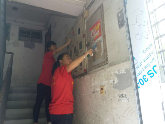 由于小广告的数量较多而且粘的太牢,给清理工作带来了一定的难度,但是却挡不住实践队员们的努力与决心。全体队员拿着铲子专注地铲除墙面上、门上、消防栓上这些形形色色的小广告,想尽各种办法与“牛皮癣”作斗争,不给小广告留下一丝生存空间。