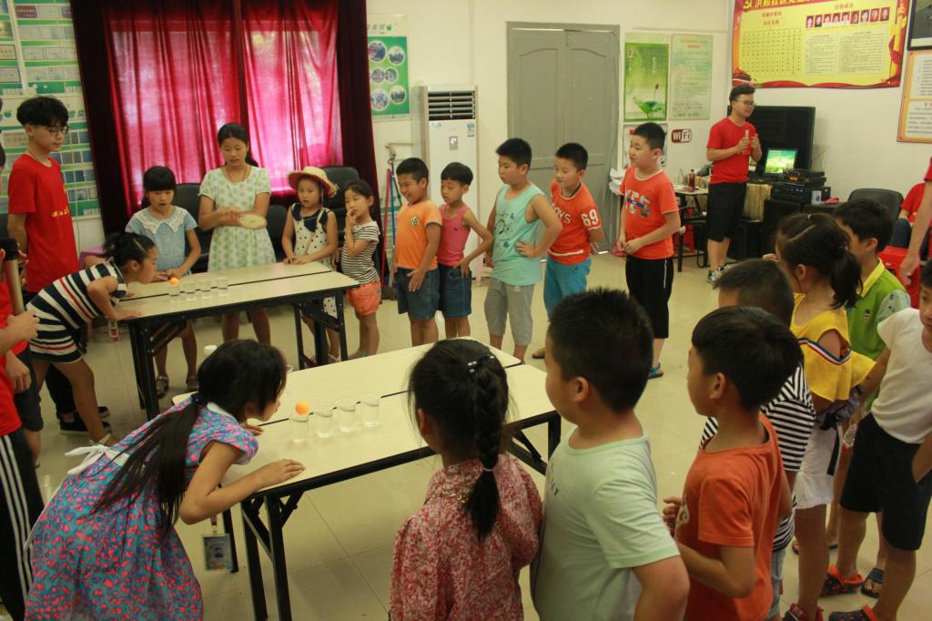 经过了上午的棋艺大比拼后,紧接着迎来了下午的团队接力趣味比赛。团队接力比赛分为四大项目,分别为第一项巧送乒乓球(用嘴巴将放在第一水杯中的乒乓求连续不断的吹到第四个水杯中)、第二项门卡关一(小朋友们与志愿者守门员开始两只小蜜蜂猜拳,如若失败,则重新尝试,成功则进入下一个关)、第三项夹弹珠(小朋友们将用筷子用左手把脸盆中的弹珠夹到另外的杯中,夹出五颗即为过关)、第四项分豪不差(将用一根筷子放在腹部左右的地方,让筷子掉入瓶中),在通过所有的关卡后,小朋友们到志愿者桌上签上自己的名字。