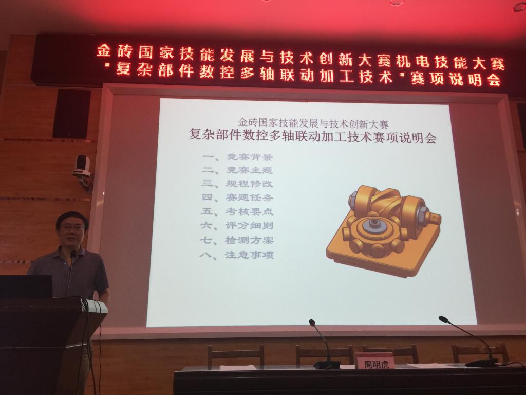 汽机分院郑道友副教授受邀担任首届金砖国家技能发展与技术创新大赛的机电技能大赛赛项的专家和裁判员,来自全国十几个省市的10位专家和24位裁判员参与本次比赛,郑老师以双重身份作为浙江省唯一代表参加,于7月8日-10日到南京参加金砖大赛复杂部件多轴数控加工技术赛项专家研讨会,就本赛项的技术文件制定、赛题的要素等内容进行研讨。并作为主要成员3人于7月30日随同裁判长到承办单位召开赛项说明会。比赛期间作为专家和裁判员参与现场裁判和评分等工作,为首届金砖国家技能发展与技术创新大赛添砖添瓦。