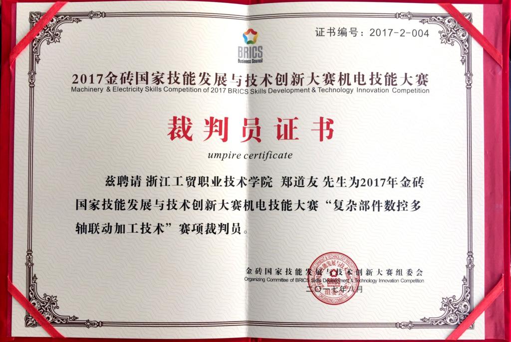 金砖国家技能发展与技术创新大赛裁判员证
