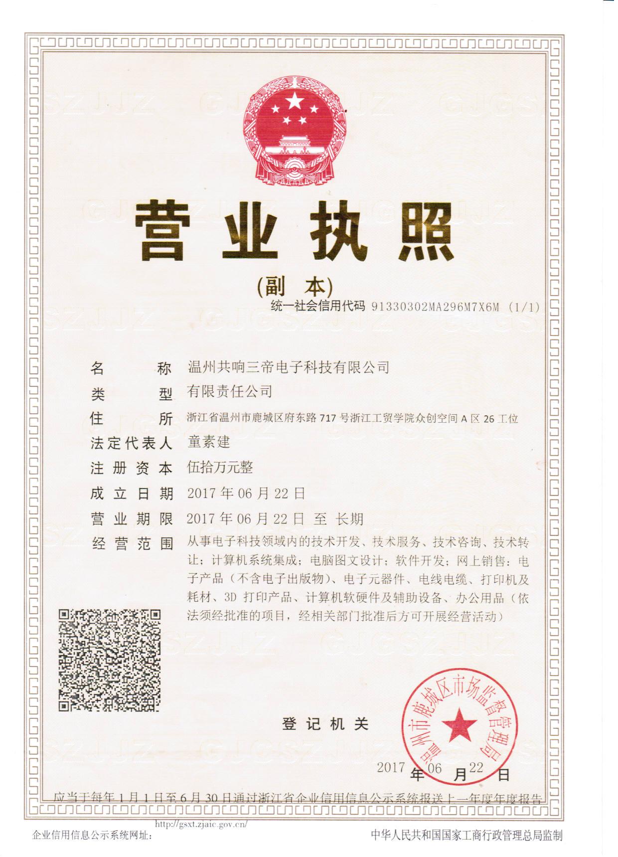 今年六月初,他们萌生了依托专业技术创业的想法,通过团队的努力,他们的项目成功入驻了学院的大学生创业园,随后在创业学院老师的帮助下,他们成功创办了“温州共响三帝电子科技有限公司”。而且自主研发了新产品——“便携式3D打印机”,这个产品也让他们获得了2017年中美青年创客大赛温州赛区的二等奖、总决赛的优胜奖。
