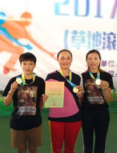 王美、郭晓敏老师、技师学院会计专业1403班的蔡依晨获得女子草地滚球比赛团体冠军