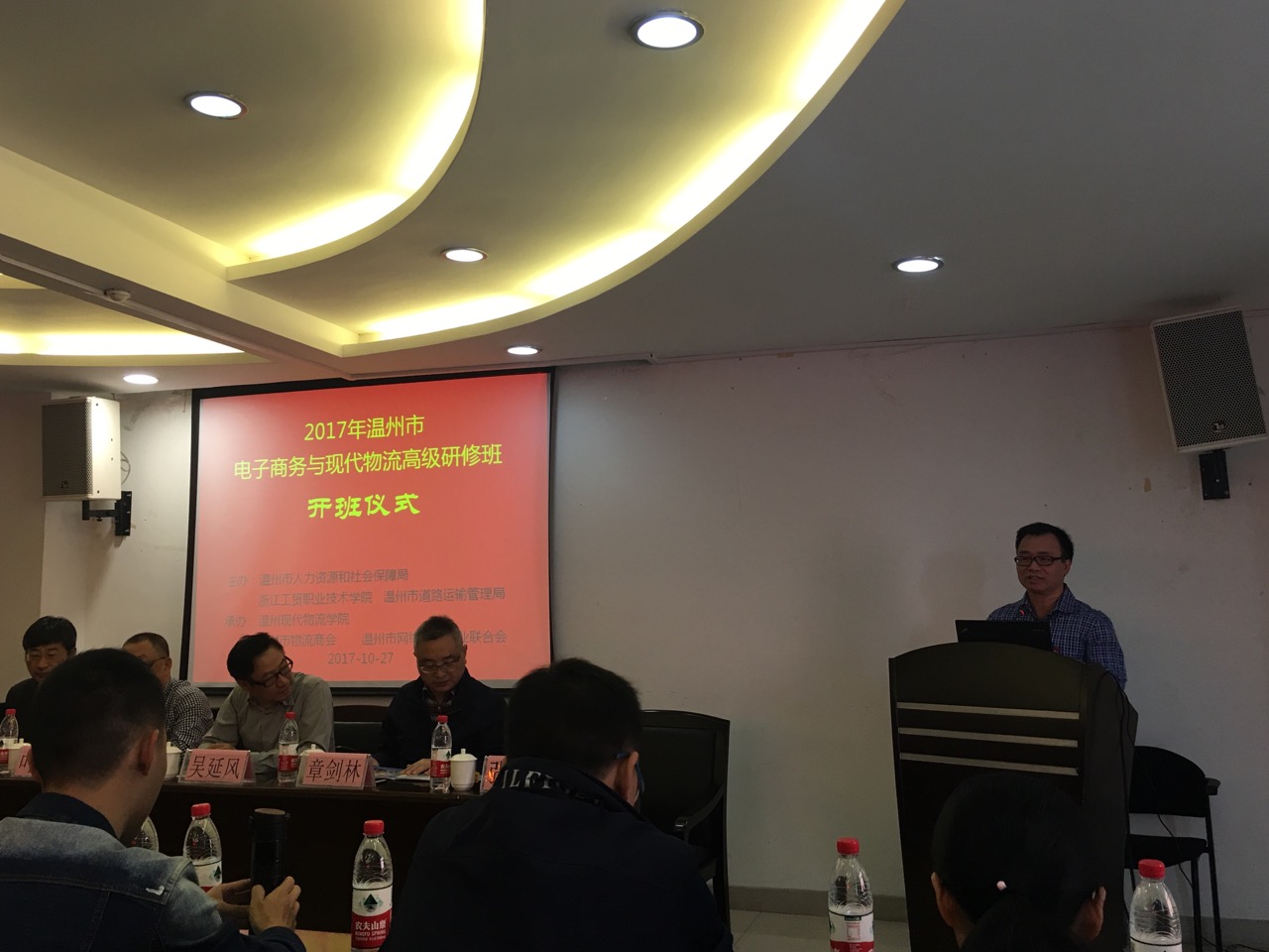 出席本次高研班开班仪式的领导嘉宾有温州市人力资源和社会保障局专技处处长吴延风、温州市道路运输管理局货运处副处长叶波、教育部全国物流职业教育教学指导委员会副主任蓝仁昌博士、阿里巴巴商学院执行院长章剑林教授、经济与贸易分院党总支书记张勰,高研班由经济与贸易分院(温州现代物流学院)副院长陈碎雷主持。