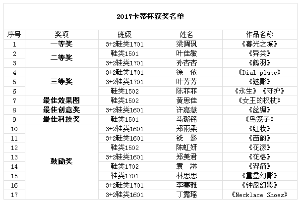首届“卡蒂杯”鞋类设计大赛参赛选手来自设计分院大一至大三鞋类设计专业在校生。经过现场三小时紧张而有序的角逐,17位选手在比赛中脱颖而出。获奖名单及作品列表如下:
