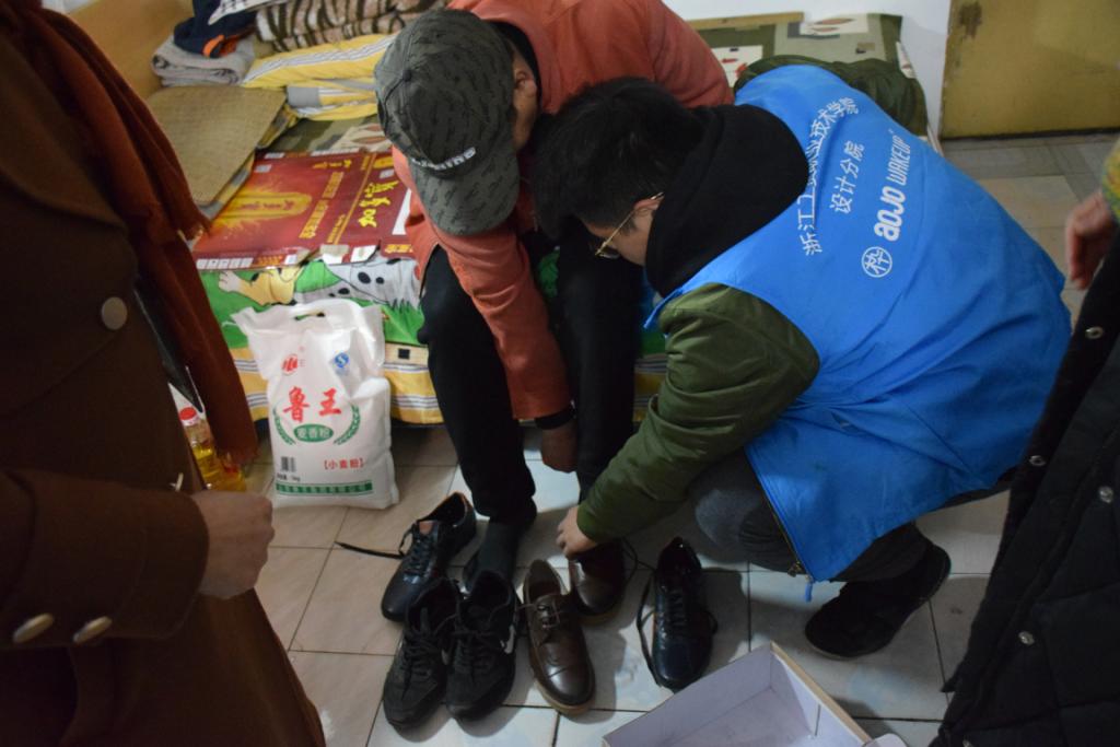 第六,慰问老人及低保户。我们组成一支队伍前往社区挨家挨户地寻访,赠送油、面粉以及由我们工贸学子自己设计制作的纯手工鞋子这些慰问品。志愿者们会根据他们尺码大小让其挑选和试穿我校学子的佳作。在与他们聊天中了解到这些群体的生活状况,对此我们将用这份心意来表达对他们的关怀,他们的每一句“谢谢”将更加肯定我们这次的活动。