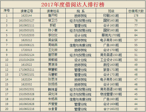 2017年度图书“借阅达人”排行榜出炉