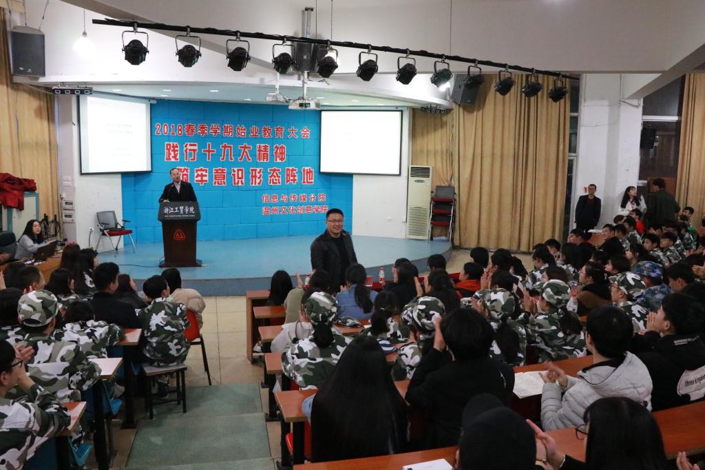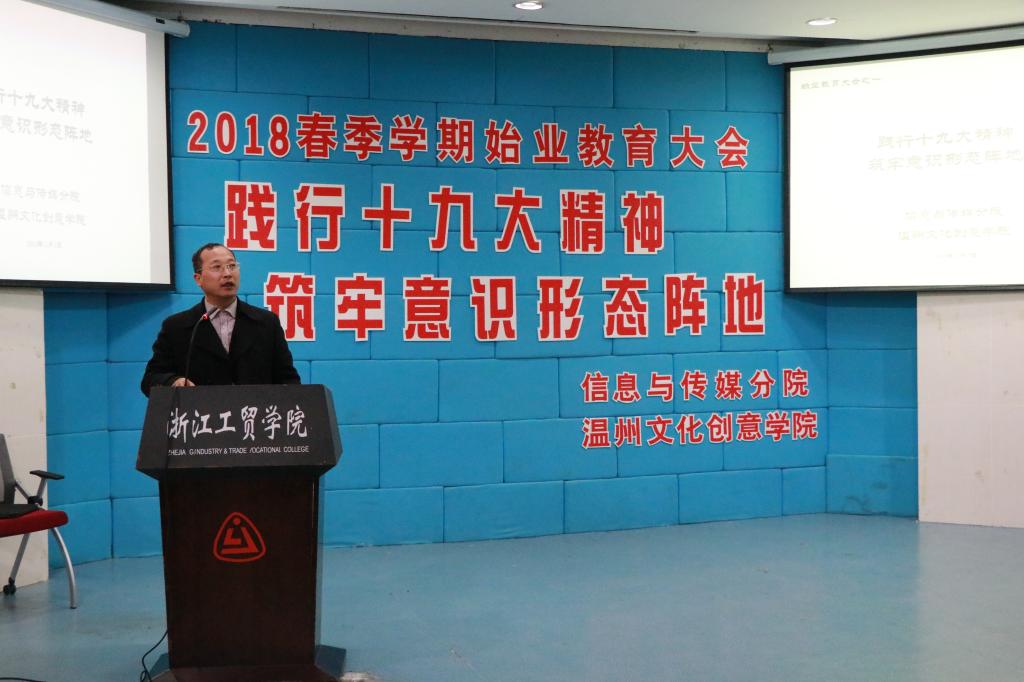 2018年3月5号下午,温州文化创意学院暨信息与传媒分院16级、17级全体同学于一号楼阶梯教室进行主题为“践行十九大精神,筑牢意识形态阵地”的始业教育,到场的有分院党总支书记任志杰、辅导员翁昭昱、陈力特以及各班班主任。