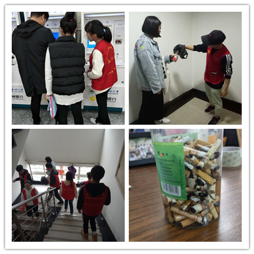 争当控烟劝导员,创无烟环境。从一楼到十九楼,分别从院区的两个安全楼道顶楼往下走,边走边捡拾楼梯上的烟头并装入我们准备好的塑料瓶中,当楼道里有人在吸烟,我们的志愿者上前礼貌地制止并告诉他们如若需要吸烟,请到院区外面的吸烟区吸烟,吸烟者也很配合的熄灭了烟。巡完一边的楼道后,两个小组交换再走一遍另一边的楼道,因为吸烟者还会出现,我们会不断走动地进行控烟。