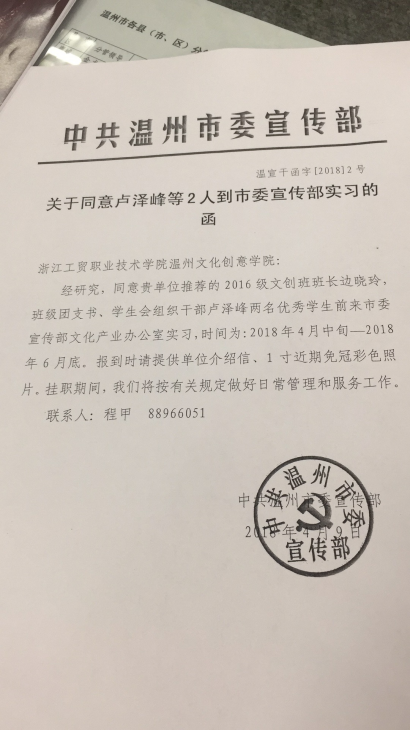 本届文创班学生中期社会实习工作还有一点值得关注的是,中共温州市委宣传部根据选派挂职干部的程序,通过面试,录取了我院两位优秀学生到宣传部文产办挂职实习,并且通过文件形式得以确认。可见,我们的实习工作得到市委宣传部的支持,同时,我们的学生也得到认可和欢迎。