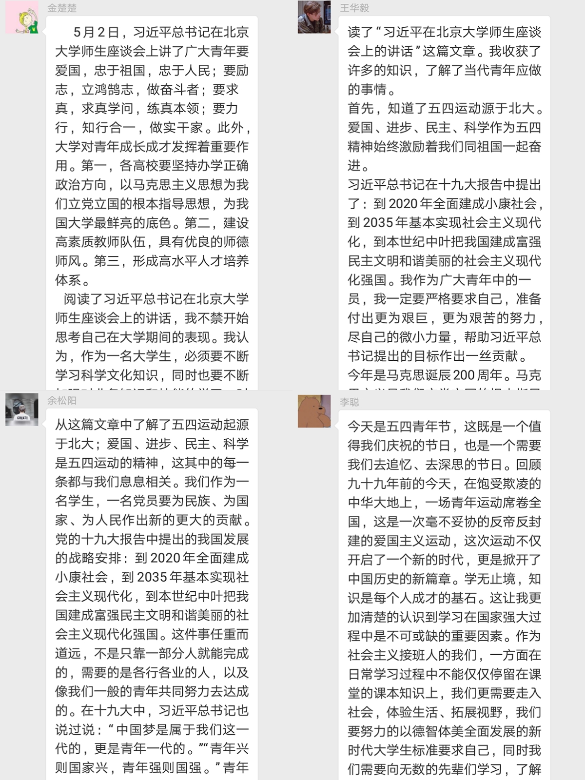 最后,学生党员们一起学习5月2日习近平总书记在北京大学师生座谈会上的讲话原文,并踊跃发表自己的读后感。有学生党员说到:“作为一名学生党员,一直以德智体美全面发展的社会主义建设者和接班人的标准严格要求自己,及时、准确、高效率的完成自己的工作任务并虚心学习其它各相关技能,成为对社会有用的复合型人才。”也有学生党员表明:“无论在做人还是做事上应该以自身之力,做到心中有信仰,肩上有责任,胸中有激情,脚下有作为,努力为祖国的建设添砖加瓦。”也有学生党员表态:“作为一名中共党员,我需要在日常生活、工作和学习中不断锤炼自我的品德意志,求真学问、练真本领。争做时代弄潮儿,争做有理想、有学问、有才干的实干家。”