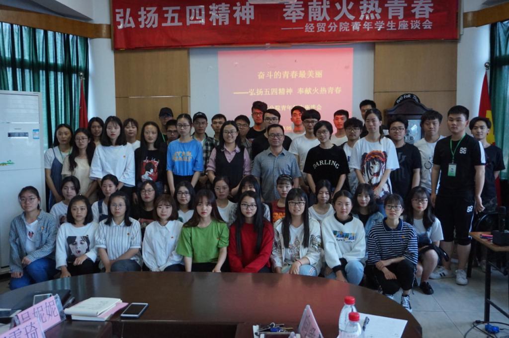 为纪念五四运动99周年,传播五四精神,经贸分院青年学生座谈会于2018年5月4日在六楼会议室成功举办。参加本次座谈会的有:经贸党总支书记张勰,辅导员向政、周妍妍、郑雪琦、吴妮妮,以及分院40位学生代表。