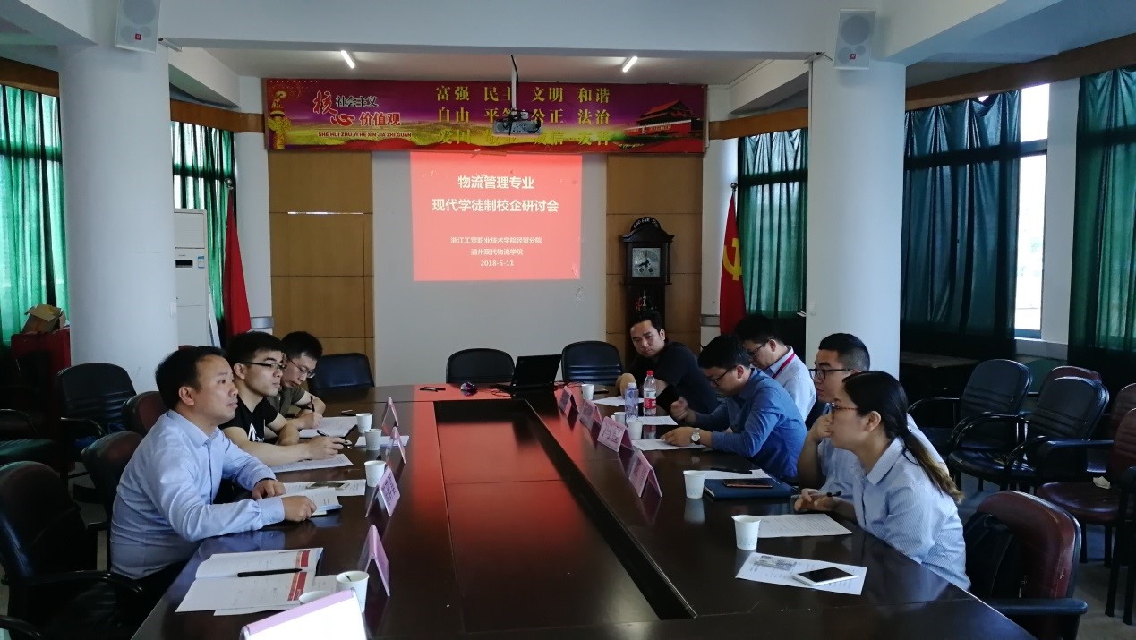 为了推进专业现代学徒制项目,深入探讨校企合作实施内容,物流管理专业于2018年5月11日下午,在1号楼6楼会议室召开现代学徒制校企研讨会。浙江人本超市有限公司人事部部长丁兆云、人本集团有限公司招聘经理戴倩、京东物流浙江地区人力资源高级经理冯宣、京东物流浙江地区人力资源校园渠道组经理杨景帅、百世物流温州地区人力资源高级经理张建军、物流管理专业主任陈再波、专业骨干教师何丹、王震宁等参加了研讨会,会议由经贸分院副院长陈碎雷主持。