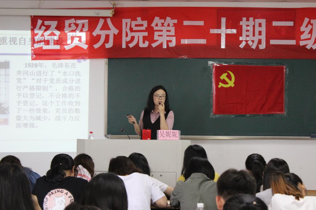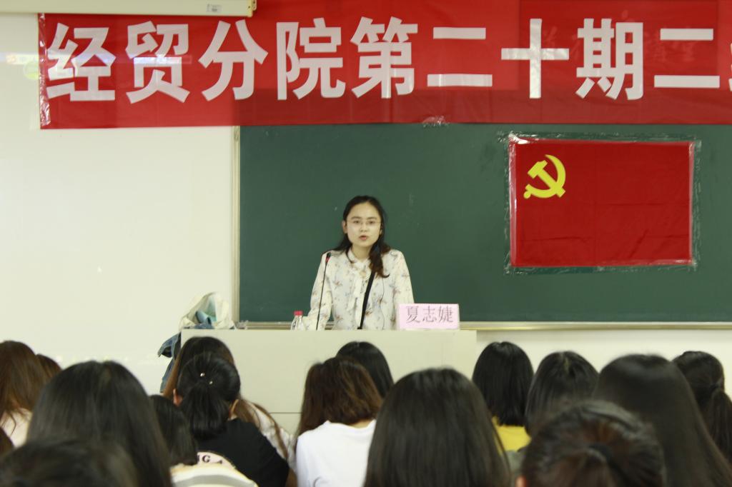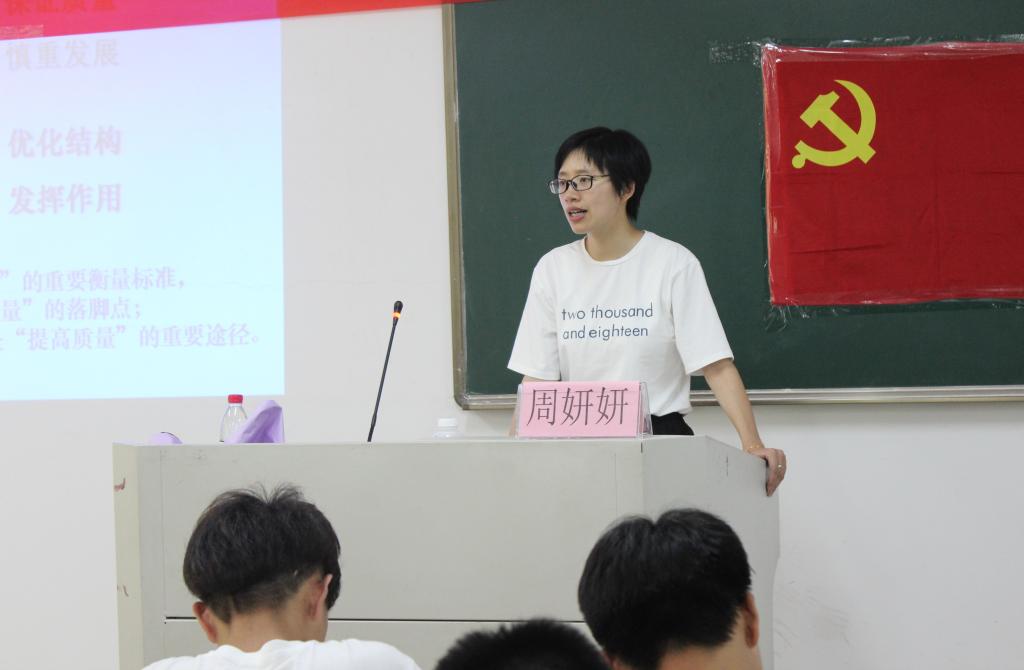 第五讲由经贸分院学生第一党支部书记周妍妍老师主讲,具讲解了党员发展的4个阶段和28项程序,并要求学员们做到材料规范填写,主动及时递交相关材料等。