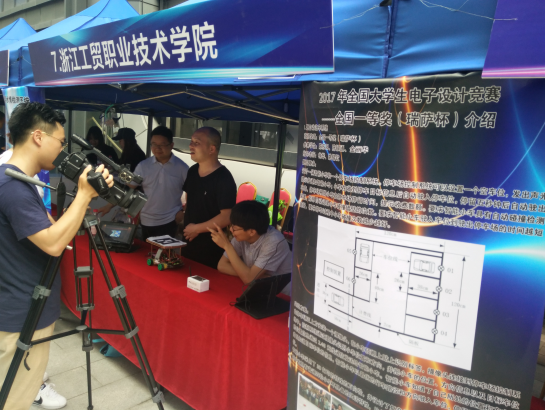 温州市“科技周”活动一年一次,今年学院科研处突出科研与教学的结合,选派师生科技作品参加活动。分别是电子工程系荣获电子设计大赛全国一等奖作品《自动泊车系统》和《水质检测系统》,参加央视《我有传家宝》节目的文创产品《木活字印刷术》及电子信息研究院自主研发的《智能识别桌》等科技项目。来自温州的科技工作者及市民纷纷体验我院参展作品,活动现场我院师生就参展科技项目与未来城市生活接受到新闻媒体采访。