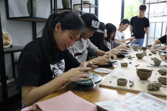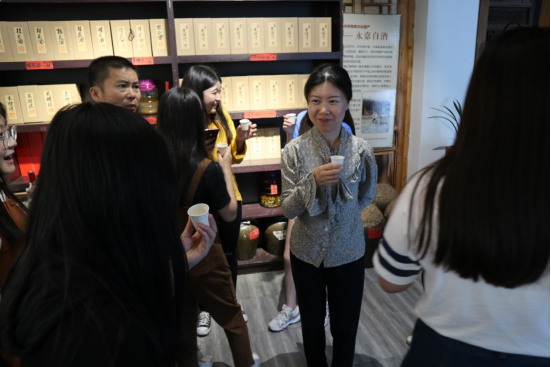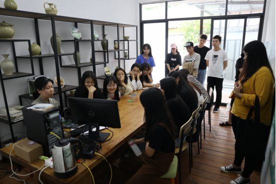 随后,吴少珺老师又带领同学们参观了瓯窑小镇,并系统的讲解了“瓯”文化。一行人分别参观了瓯窑遗址、泉客酒坊、瓯窑陈列馆、文创工作室等。同学们尤其对“泉客”的酿酒文化深感兴趣。“泉客”是一项关于永嘉酒文化的非遗项目,其酒文化研究所还在建设中。在他们烧制白酒的作坊里,多个正在发酵的酒坛子时时散发出陈酒的清香,作坊主人还请大家酌了少许米酒。在阵阵酒香中,主人又带领大家参观了楼上陈列着的各类古代酒器,这些酒器皆由瓯瓷制成、造型精美、令人赞叹。
