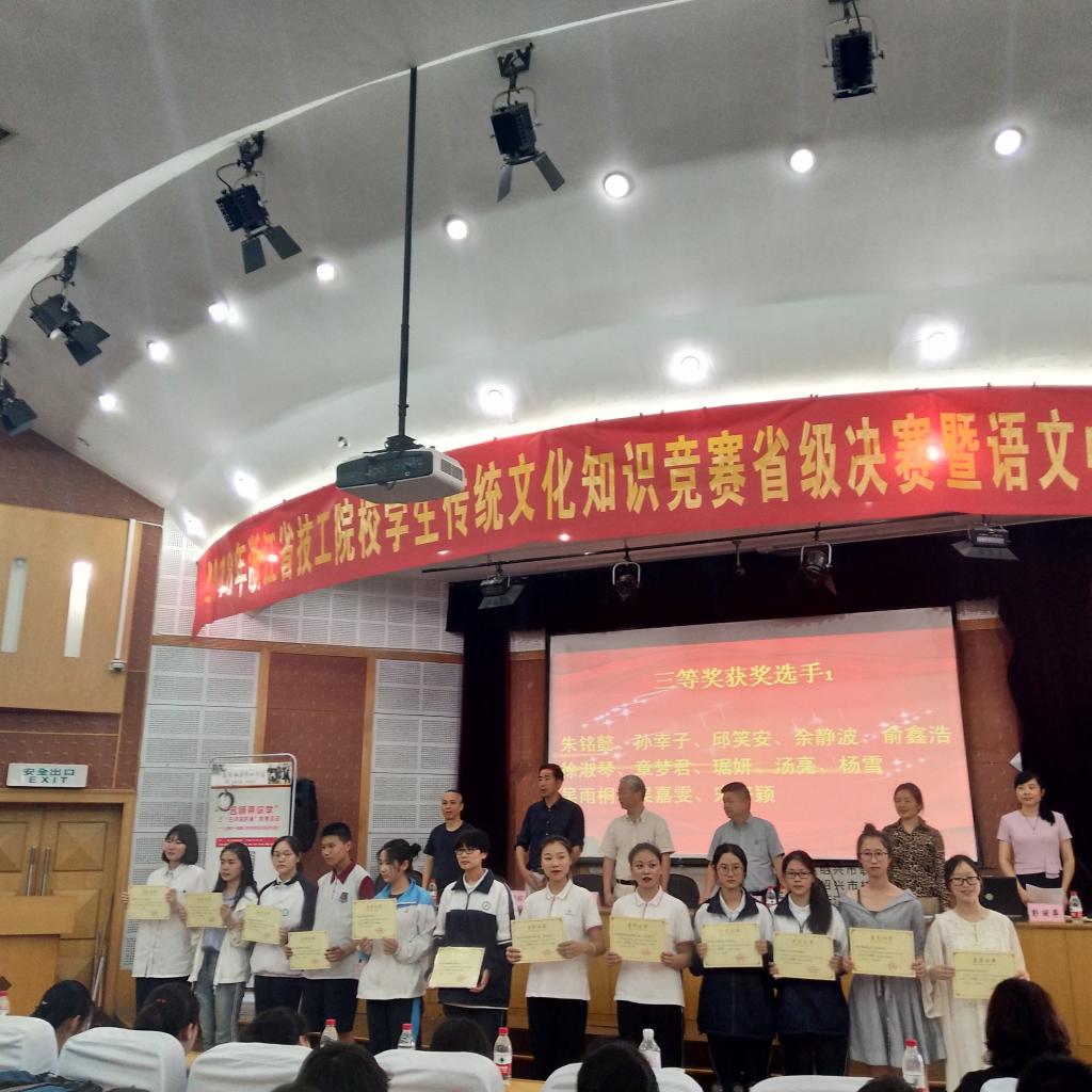 5月24日,由浙江省职业技能教学研究所主办的2018年全省技工院校学生传统文化知识学习与竞赛活动在绍兴技师学院圆满落下帷幕。本次赛事,共有44支学校代表队参加,参赛学生130余名。经过激烈角逐,我院学生孙幸子仅次于亚军总分几分之差,荣获三等奖,为我院再添光彩。