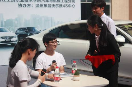 在经过初赛评审同学们的营销策划方案后,筛选出晋级决赛的选手,参加技能模拟的决赛环节。汽车销售综合技能对应的是汽车销售岗位的全面技能要求,本赛项旨在考核选手对整个销售流程的熟悉程度和应对不同类型背景的顾客所表现出的销售技能和技巧的运用能力,是对选手汽车销售技能的全面考察,要求选手具有商务礼仪的良好训练,对汽车销售业务全过程的熟练把握和销售技巧的灵魂运用,同时要求具有娴熟的语言沟通技能和灵活恰当的应变能力。莅临本次比赛的评委有汽车专业教师何浩瀛老师,徐文斐老师,林谢唯老师,还有本次的赞助商代表来自温州东昌沃尔沃王竑量内训师。