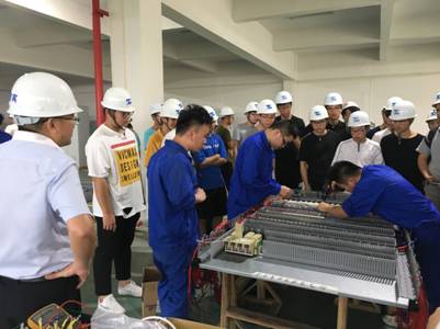 讲座介绍后环保学院机电一体化(智能环保设备方向)专业学生赴浙江伟明环保设备有限公司参观学习,在工作人员的带领下,同学们来到了公司自动化控制研究室电装生产车间,该研究室主要负责电厂自动化控制系统和设备配套的电控系统的设计、生产和调试,伟明公司垃圾焚烧项目上使用的自动化控制系统的机柜都是在这里组装生产的。电装生产车间包括接线区和调试区,接线区是电装主要生产区,完成机柜面板的元件组装和接线工作,机柜组装完成后,需在调试区进行出厂调试,合格后送入成品区,打包发货。