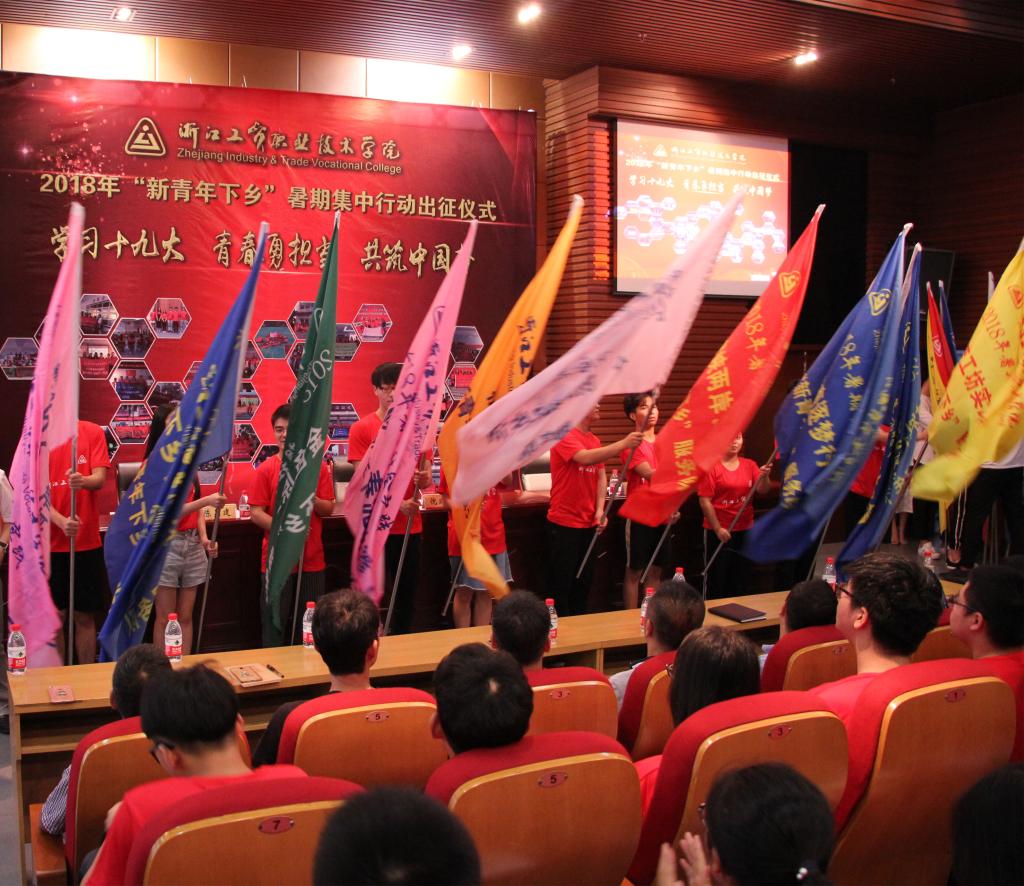 仪式上,与会领导为34支志愿者代表队授旗,全体参加暑期社会实践同学宣誓:“将秉承“大气致远 精工诚贸”的校训精神,坚决服从团队指挥,自觉遵守团队纪律,时刻注意自身言行,彰显学校风采。以最积极的心态,最饱满的热情,认真完成各项实践任务。使命不渝、奋进不息,为服务群众所需、助推地方发展贡献青春力量!”