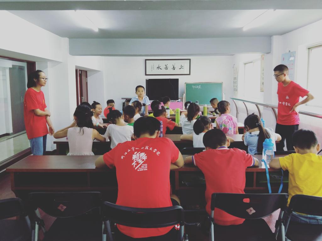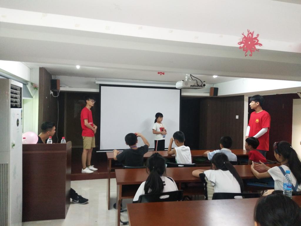 两个班的开营第一课,也是大有不同。那么,一班的开营第一课是什么样子的呢?让我们一起去看看吧。孩子们和志愿者老师们的第一次见面,自我介绍肯定是必不可少的,为了让孩子们能尽早的相互认识并熟知其他同学的名字,志愿者老师决定让孩子们一个个上台,介绍自己的名字、爱好及同班的“老熟人”等。当一个孩子说完自己的名字后,老师还会让下面的孩子们一起大声的喊出这位学生的名字。慢慢地,孩子们能够在欢声笑语中,记住并能准确地喊出别人的名字。除了自我介绍,还有讲解夏令营规章制度、积分规则、分组和孩子们最爱的游戏环节。开展完这次活动,孩子们不仅更加熟悉了周围的“新同学”,还变得更加遵守课堂纪律,从一开始的吵吵闹闹,到最后的安安静静,可谓是收获满满。