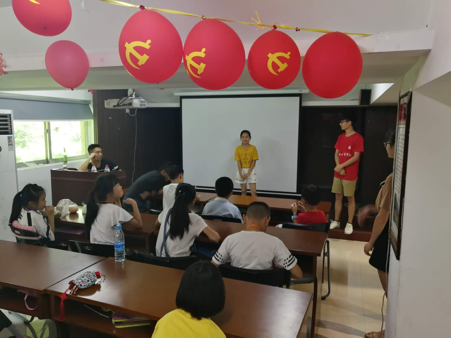 活动伊始,每位小朋友都怀揣着饱满的热情在位置上等待开营仪式,瞬间点燃了礼堂冷寂的氛围。紧接着由社区领导开始授旗授牌仪式,志愿者手上端着沉甸甸的牌子,内心突然涌起一股对夏令营的期待之情,同时自己也是倍感压力。最后是由学生代表以及带班老师分别上台合影,来结束本次的开营仪式。