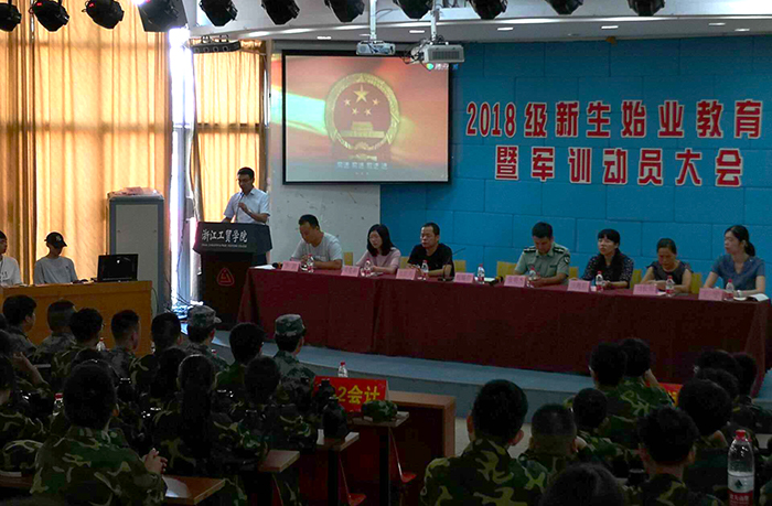 9月14日早上8点,工贸技师学院2018级新生开学典礼暨军训动员大会在一号楼阶梯教室隆重举行。副院长程树存老师、鹿城区七都街道武装部张明杰部长及参训教官、新生班主任出席会议,会议由程瑞存老师主讲。