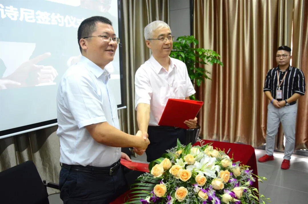 卓诗尼公司人力资源部徐伟经理首先对现代学徒制班级培养方案进行详细说明,在出席签约仪式的全体人员的共同见证下,贺星岳院长与吴轶晖副总裁代表校企双方签订了现代学徒制项目合作协议。贺院长就卓诗尼公司对现代学徒制校企合作项目的高度重视、方案具体、路径明确给予了高度赞赏。他指出卓诗尼公司是鞋革行业中的佼佼者,相信此次与公司的签约定能让双方今后在现代学徒制人才培养模式改革、推进产教融合、校企合作等方面迈入新的台阶。同时也对同学们提出了希望,希望同学们珍惜机会,夯实专业技能,提升职业素养,做好职业发展规划。