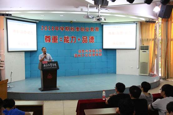 2018年9月17日下午,信息与传媒分院(温州文化创意学院)于一号楼阶梯教室举行了主题为“新征程目标首定 大学问做人第一”的2018年秋季学期新生始业教育大会。莅临此次会议领导和嘉宾有信息与传媒分院党组织负责人任志杰老师、信息与传媒分院院长潘修强老师、计算机专业主任章增优老师、软件专业主任金慧峰老师、动漫专业主任朱诗孝老师、广告专业主任林朝荣老师、印图专业主任任杨道文老师、文创专业主任余好老师,院长助理尚辉老师、办公室主任张淑琴老师、教学秘书李慧老师;辅导员翁昭昱老师、陈力特老师、张杨燕老师;学生会主席王浚宇同学、学生会主席助理陈一颖同学以及新生代表动漫1802班郑雅尹同学和软件1803班廖智伟同学。