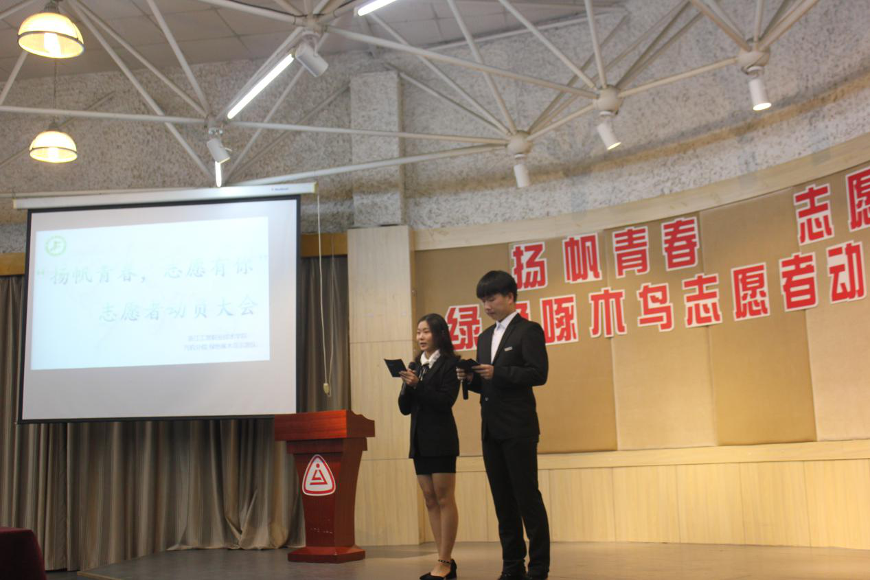 动员大会由分院团总支学生会实践部部长助理沈思远和干事陆思敏主持。首先,由志愿者刘鑫介绍了绿色啄木鸟志愿队的历程,从在北京建立志愿队到成立绿色啄木鸟志愿队温州分部并落户浙工贸,讲述了绿色啄木鸟所走过的十年历程;分享绿色啄木鸟志愿队过去一年的活动点滴和剪影;并谈及绿色啄木鸟2018-2019学年的活动规划。通过介绍,希望在场的新志愿者们了解啄木鸟志愿者。