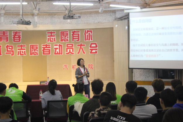 而自2014年起,绿色啄木鸟志愿队一直与星乐建立服务活动关系,组织志愿者多次前往星乐、或在校园内外开展自闭症系列活动。为此,邀请了星乐儿童成长中心的发展部主任钟素芳老师出席本次志愿者动员大会,并上台为到场的志愿者们作自闭症知识讲座,普及宣传关爱自闭症儿童。在场的志愿者们认真听讲,为以后的志愿服务储备相关知识。