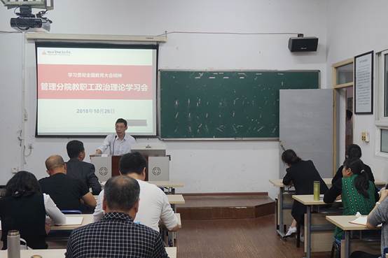 为了学习贯彻全国教育大会精神,加强和改进分院教职工政治理论学习工作,提高分院教职工政治思想理论水平和思想道德素质,提升思想政治教育能力,管理分院于2018年10月26日在5208教室召开教职工政治理论学习会,管理分院全体教职工参加,会议由管理分院党总支书记项光春老师主持。
